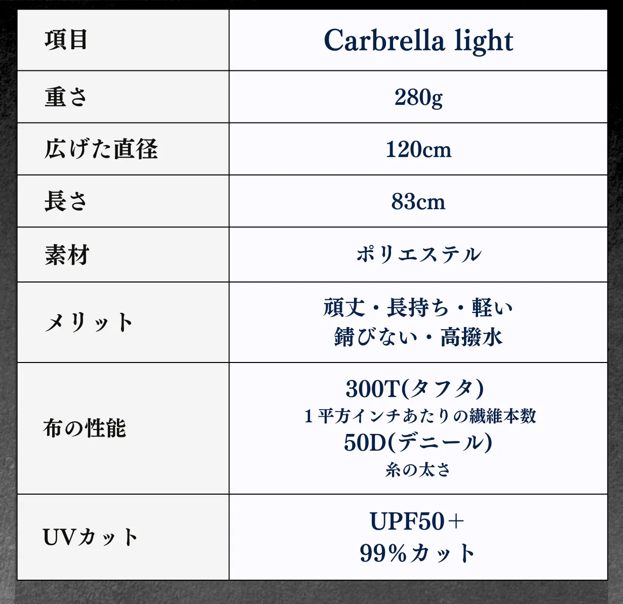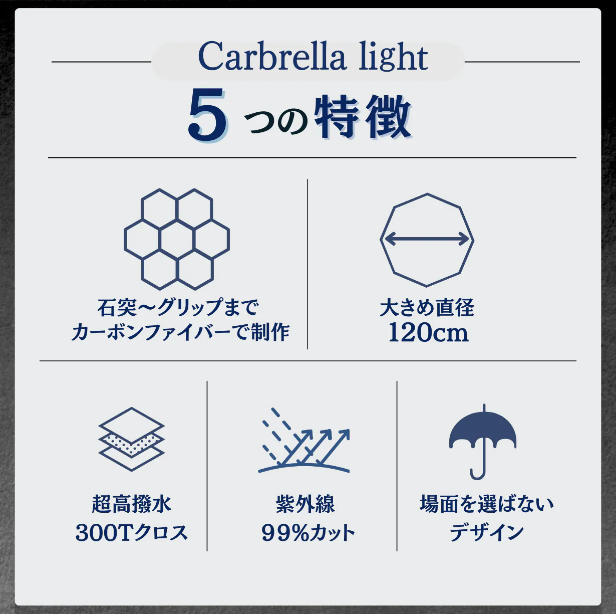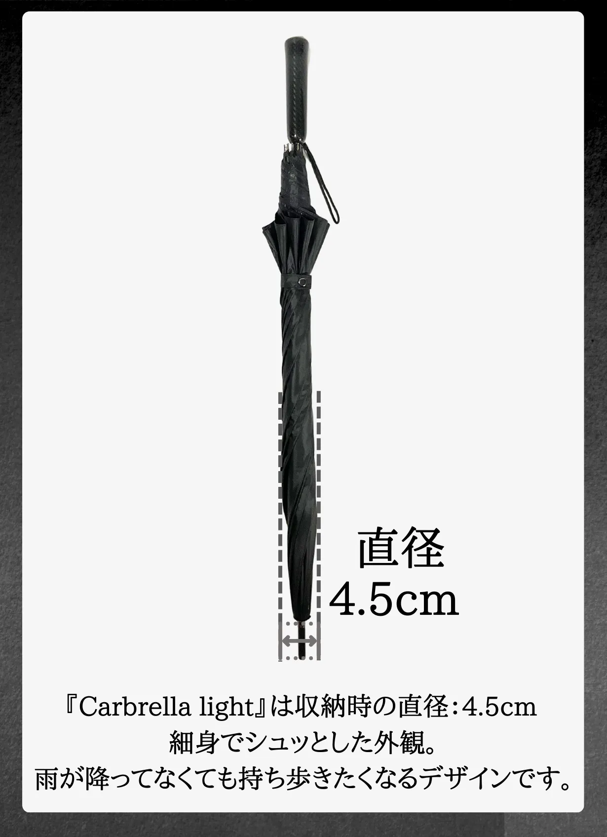 『超軽量』『超頑丈』『超はっ水』という高性能なCarbrella lightは『全ての季節をあなたと共に歩む傘』を目指して作られた一生モノの長傘です。