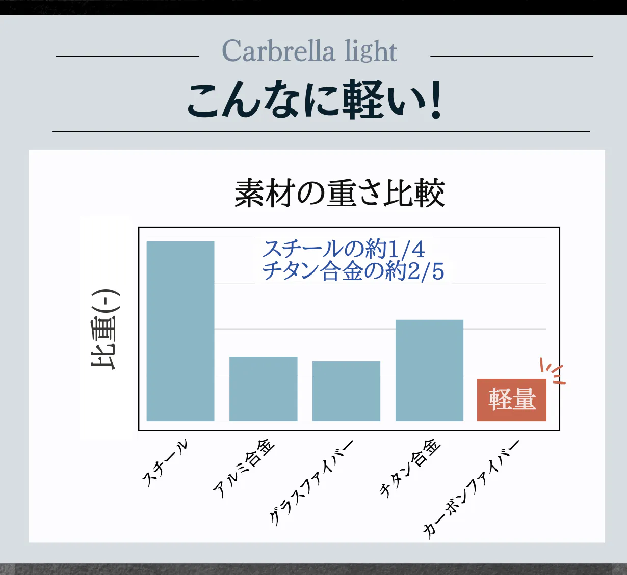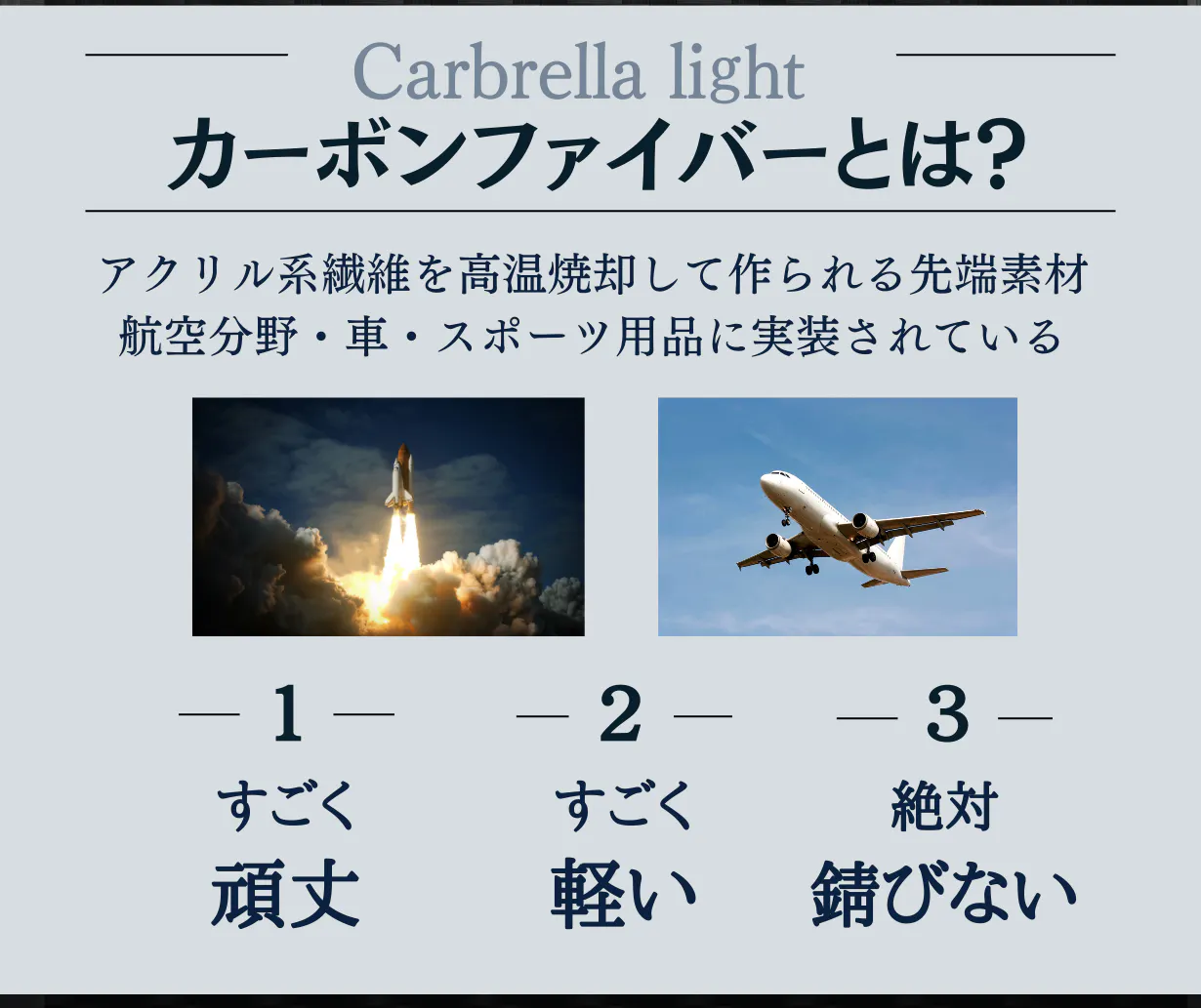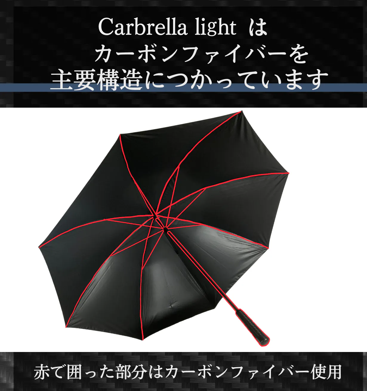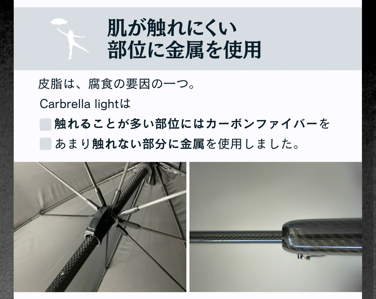 Carbrella lightは手で触れることが多い部分に耐蝕性が高いカーボンファイバーを使用することで傘の劣化を防いでいます。