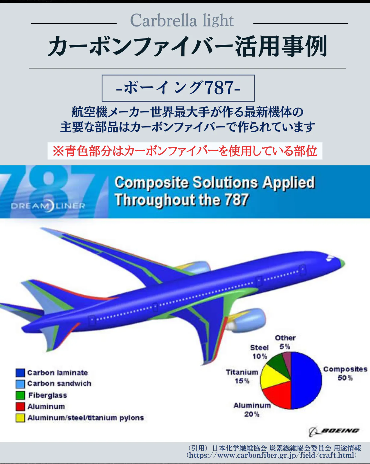 下に示すように世界最大手の航空機メーカーが製造する飛行機の主要な部品はカーボンファイバーで作られています。