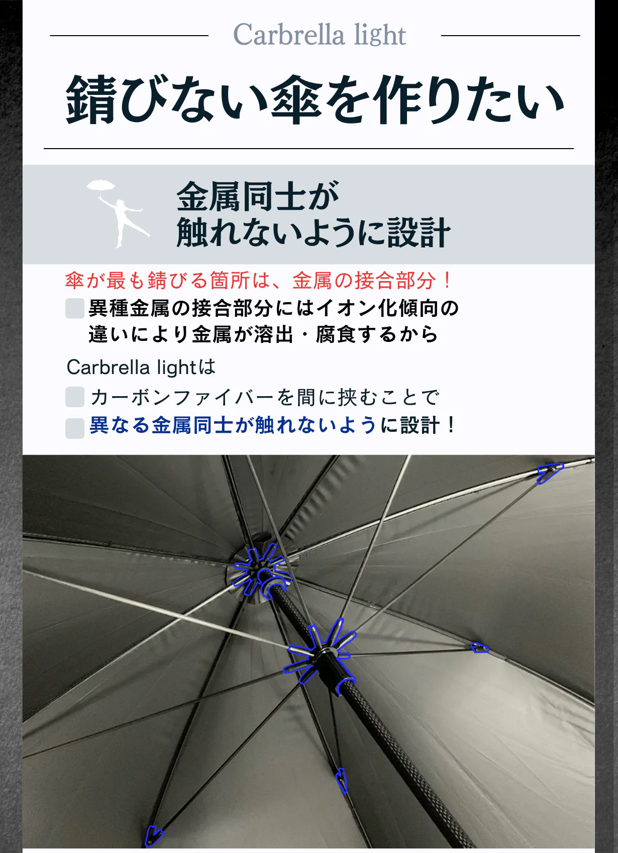 傘の構造上、どうしても金属を使用しなければならない場所がありますが、錆が発生しないように異種金属が接触しない工夫をしています。