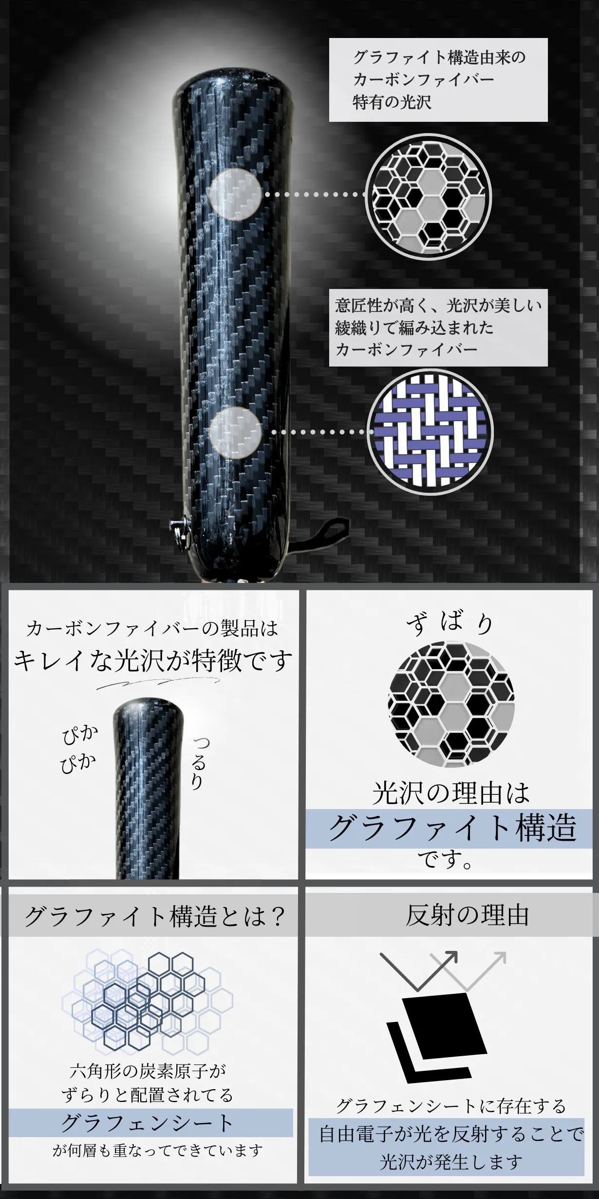 金属とは一味違ったカーボンファイバー特有の光沢を楽しめます。グリップはカーボンファイバーの露出が多くなる綾織り(あやおり)、中棒(シャフト)は強度が高くなる平織り(ひらおり)を採用しています。