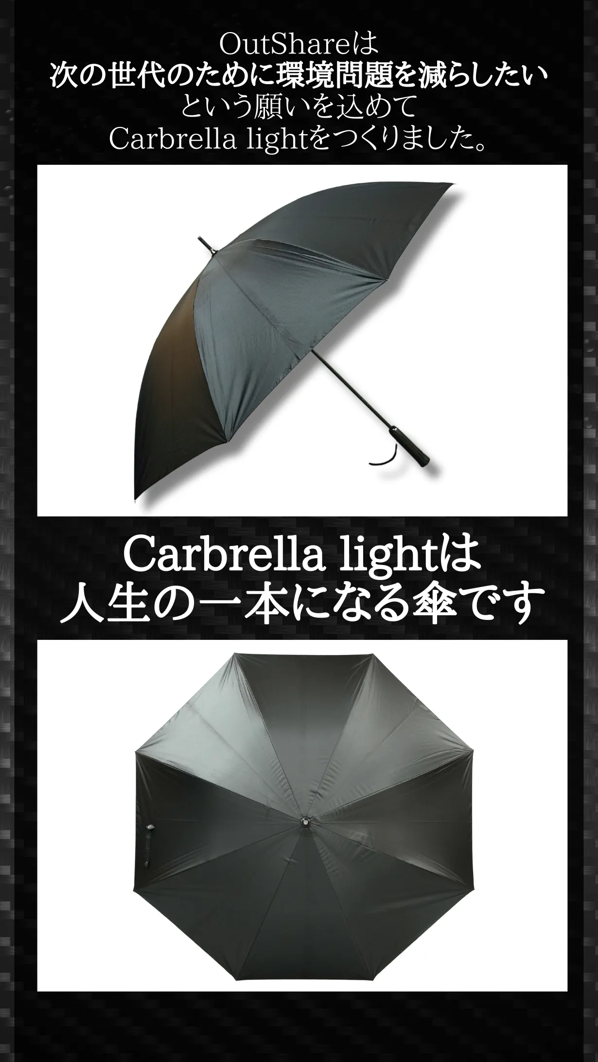 本ページをご覧頂き、誠にありがとうございます。アウトシェアは株式会社モノツク工業運営するECブランドです。私たちは「日常に一匙の非日常を」をコンセプトに手に取った人がワクワクするようなプロダクトを提供することを目指しております。弊社代表は長年カーボンファイバーの開発にかかわっており、Carbrellaは非常に思い入れの深い商品となりました。カーボンファイバーは錆びない、軽い、丈夫という優れた特性を持っている一方で、これまでは航空機やロケットなど大規模な製品に使われることがメインで、一般の方の目に触れる機会は多くありませんでした。そこで、一般の方がカーボンファイバーの優れた特性を体感できる商品を開発したいと思い、本プロジェクトを起案しました。傘に使用することで錆びない、軽い、丈夫というカーボンファイバーの特性を最大限に活かすことができたと思っています。また、Carbrellaに愛着を持っていただくことで、日々廃棄されるビニール傘を少しでも減らすことができ、環境問題の一助になれればと思っております。Carbrellaを通してサポーターの皆様に新たな価値を届けることができればそれに勝る喜びはありません。サポーターの皆様の生活がより豊かになることを願っております。本プロジェクトに関して、至らぬ点は多くあるかと思いますが、精一杯ご対応させていただきます。リターン品にトラブルがあったときはもちろん些細なご質問でもよいのでお気軽にお問い合わせください。