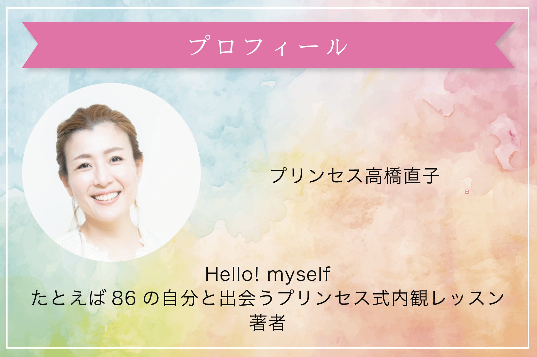 書籍『Hello! myself たとえば86の自分と出会うプリンセス式内観レッスン』を出版する著者、プリンセス高橋直子です。