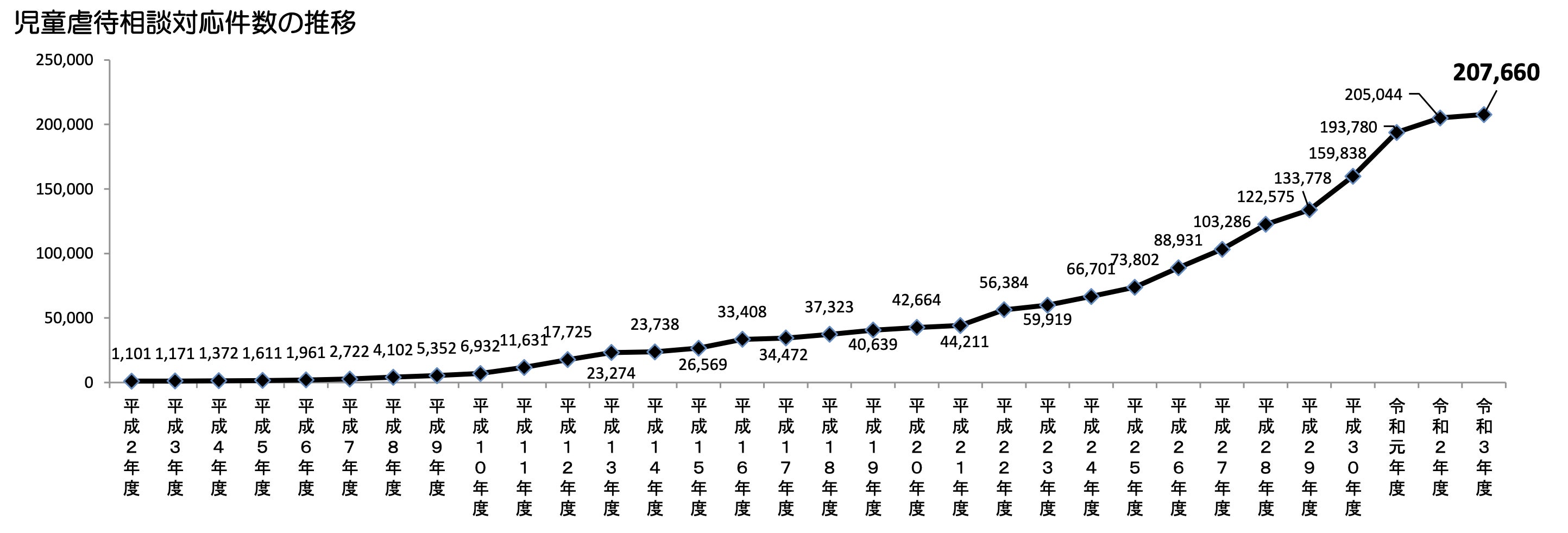 全国225か所の児童相談所が児童虐待相談として対応した件数は207,660件で、過去最多。