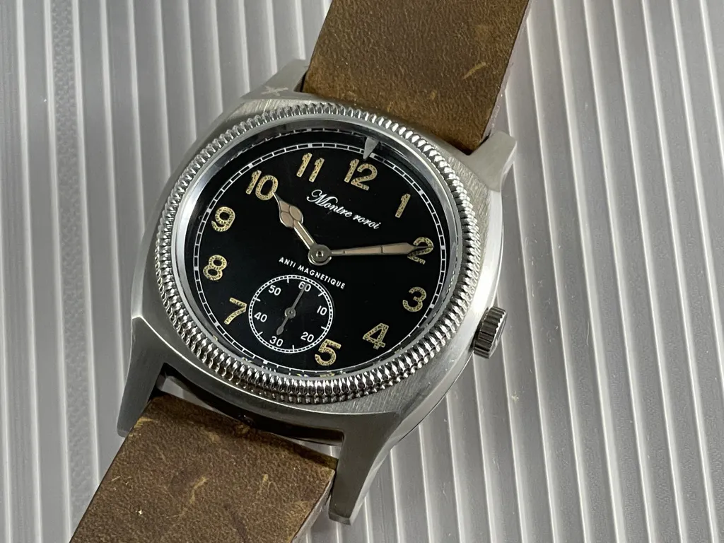 文字盤12時側に筆記体で製造者”Montre roroi” モントルロロイのロゴ、そしてスモールセコンドの上に“ANTI-MAGNETIQUE”の文字がプリントされています。