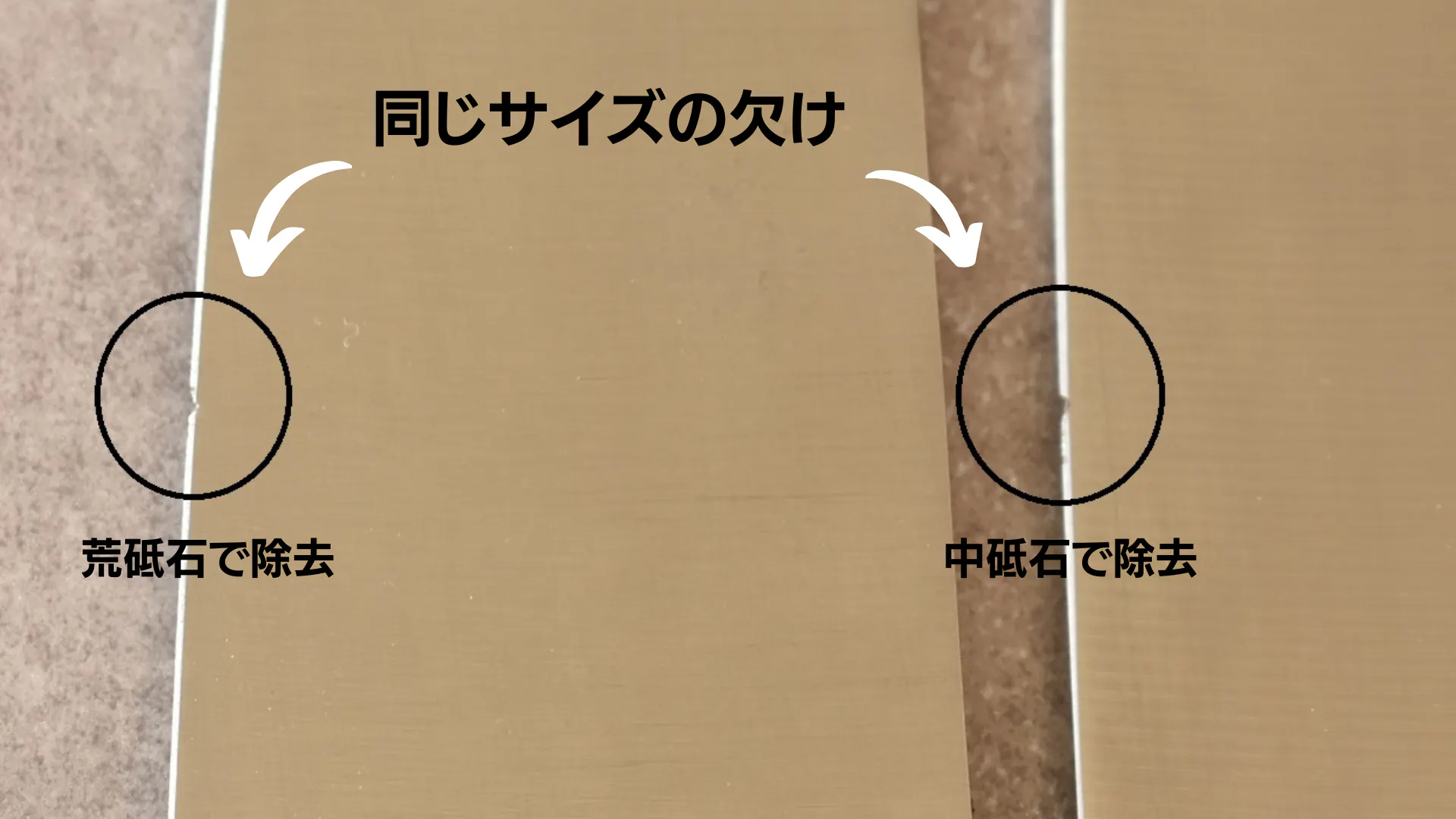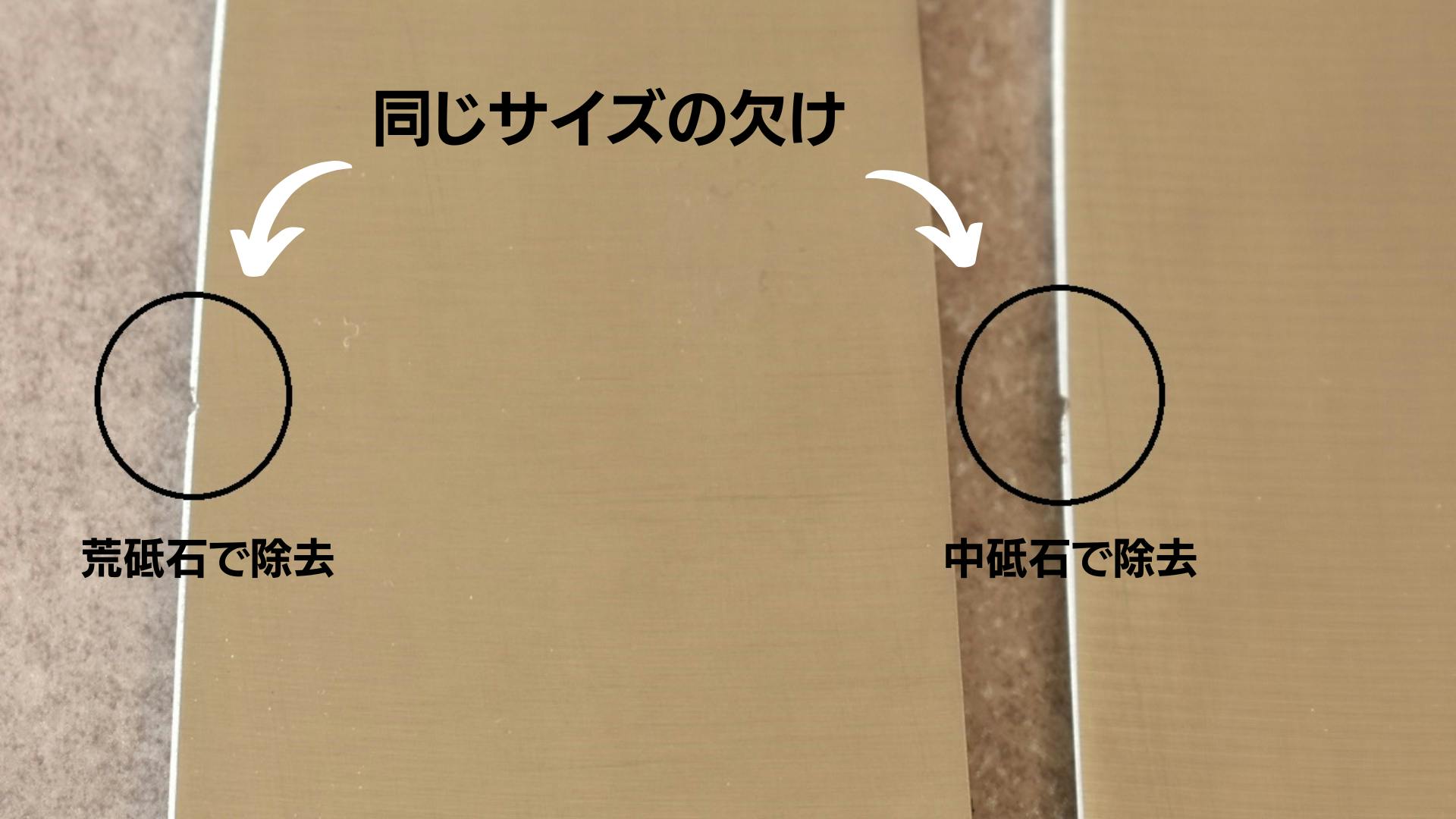 荒砥石の重要性を説明する為に、全く同じ種類の欠けた包丁2本を用意して実験を行いました。
