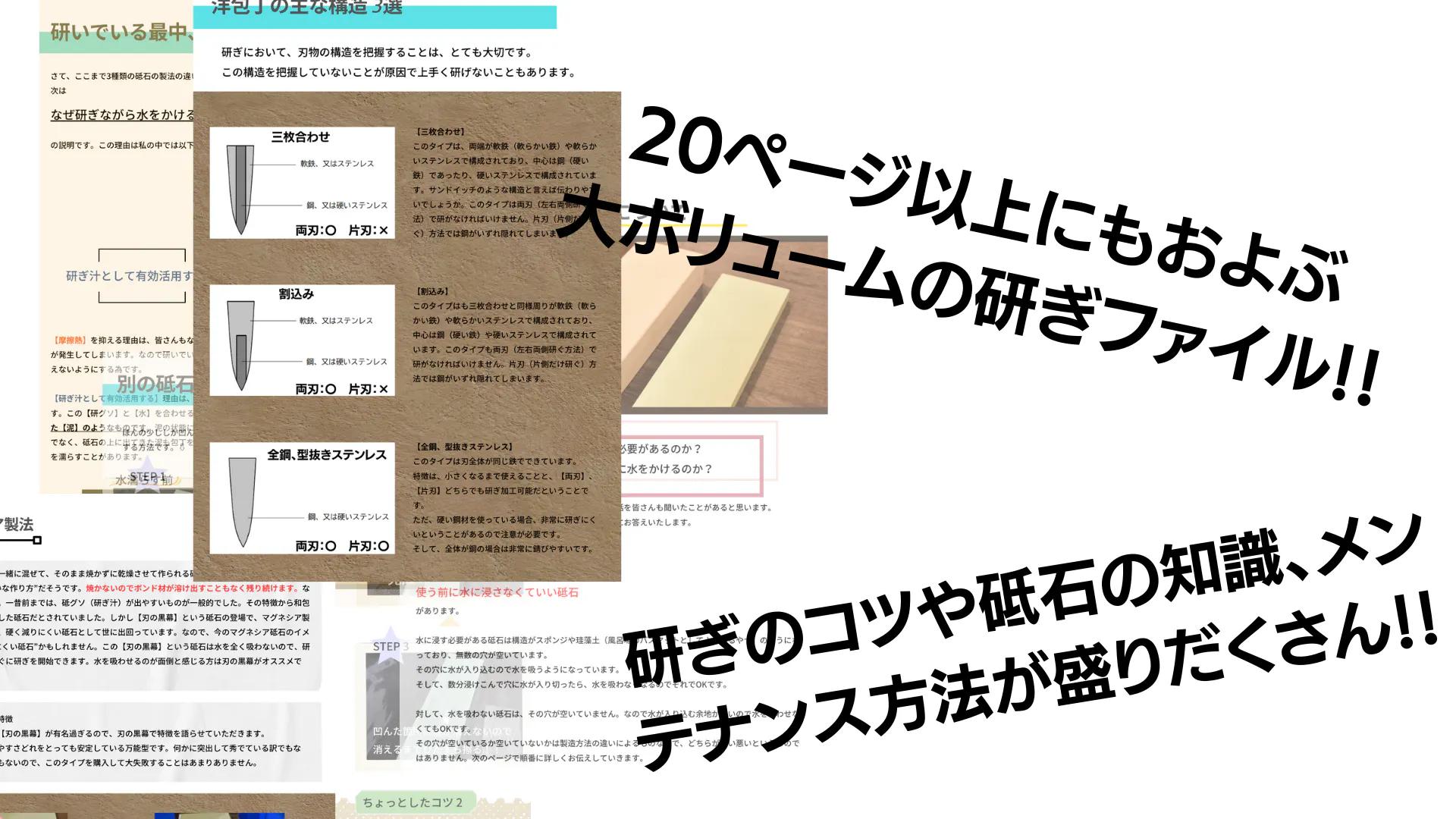 研ぎファイルの内容は、家庭用包丁(三徳包丁、牛刀、ペティナイフ)の研ぎ方が載っているので、その他の刃物の研ぎ方が学びたい方は、研ぎ講習プランをお選びください。