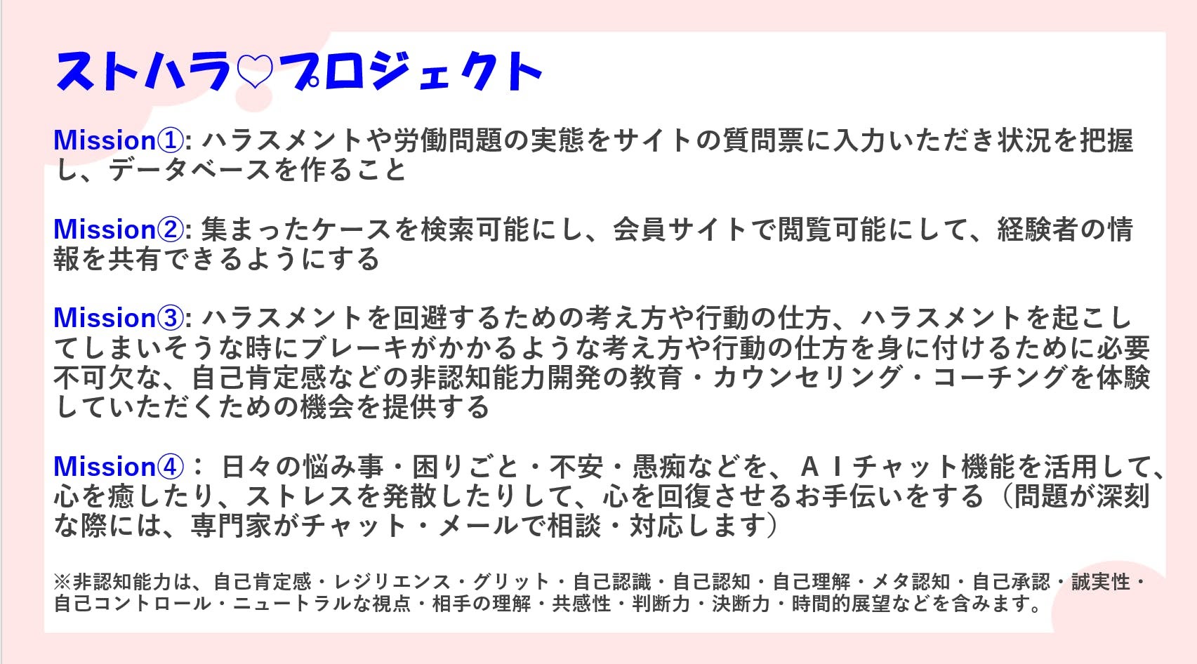 ハラスメントに悩む方々に寄り添えるようなAIチャット「アイちゃん」の実現に向けて、引き続きご支援、サポートのほど宜しくお願いいたします。