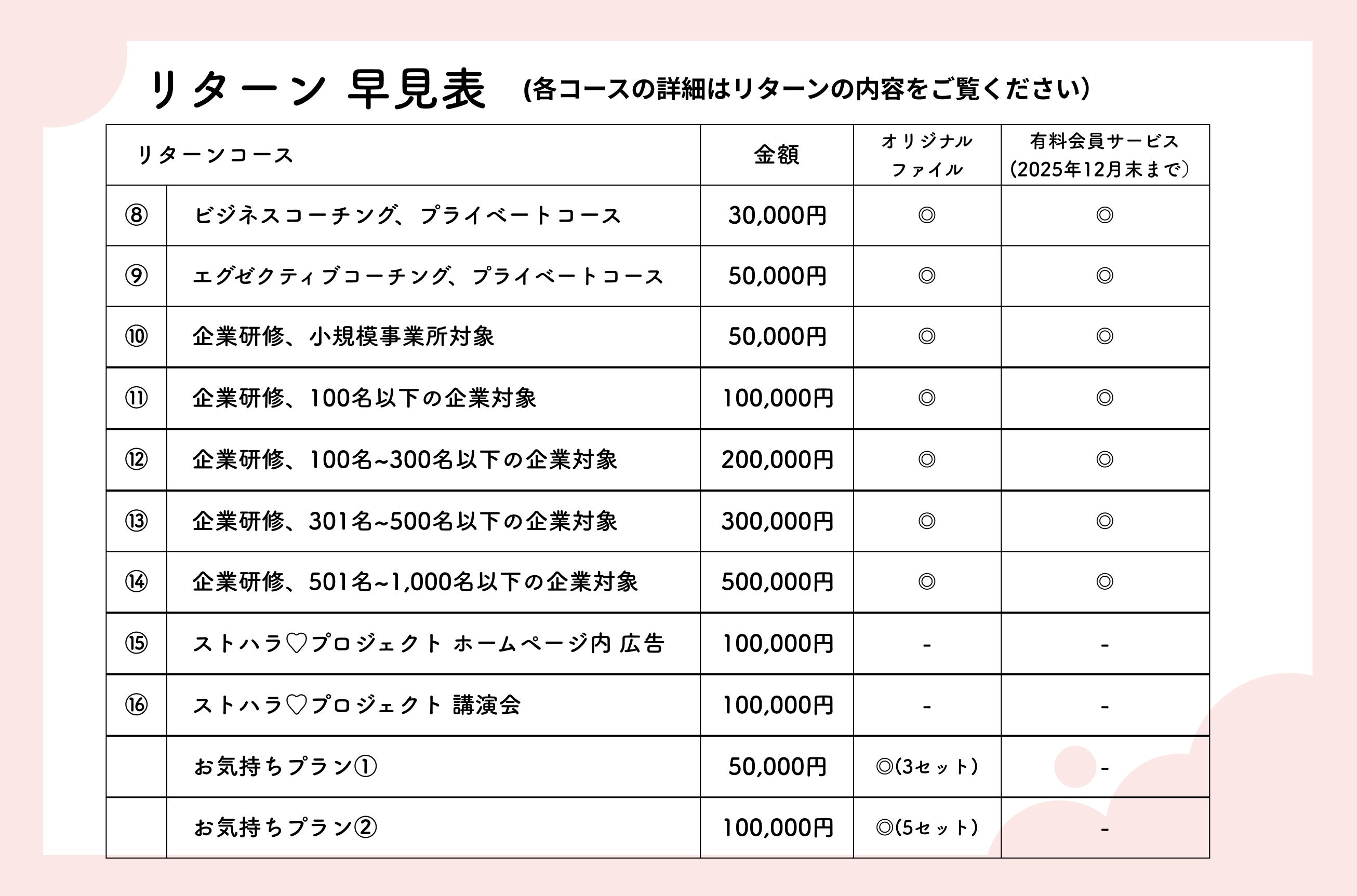 無料会員のサービスに加え、AIによるチャットでのハラスメント・労働問題の相談、チャットまたはメールでの専門家への相談、非認知能力開発(自己肯定感・自己承認・レジリエンス他)の無料セミナー、コーチング無料体験、等のサービスを提供します。本格的な研修・コーチングをご希望の方には、割引クーポンを差し上げます。AI機能を活用して、AIによる自己肯定感向上のアプリ利用、ストハラ♡研究所研究員アイにゃんの「メッセージ、占い、癒し画像」等のサービスも充実していく予定です。(会員規約、プライバシーポリシー)