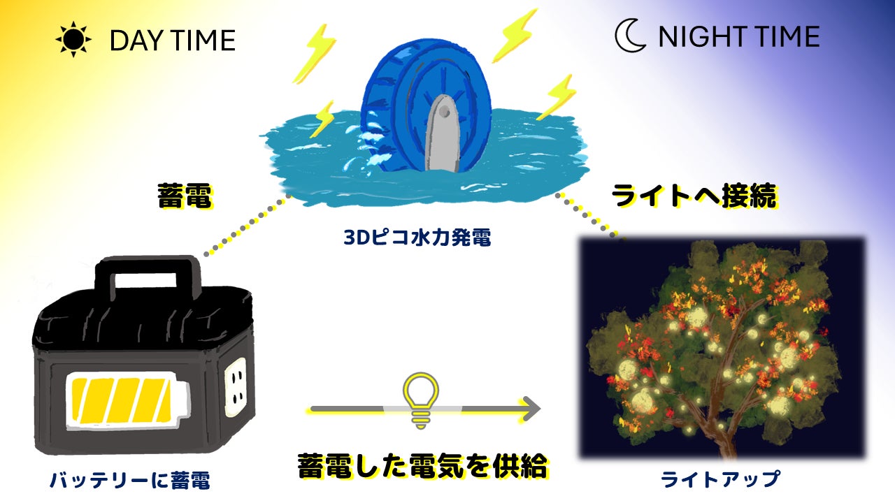 上の図に示すように、日中はたかむろ水光園園内に設置したピコ水力発電システムで発電した電気をバッテリーに充電します。夜間に実施する園内でのライトアップでは、このピコ水力発電システムをライトに接続します。また日中充電しておいた電気を供給することで、水力発電由来の電力でのライトアップを実現します。
