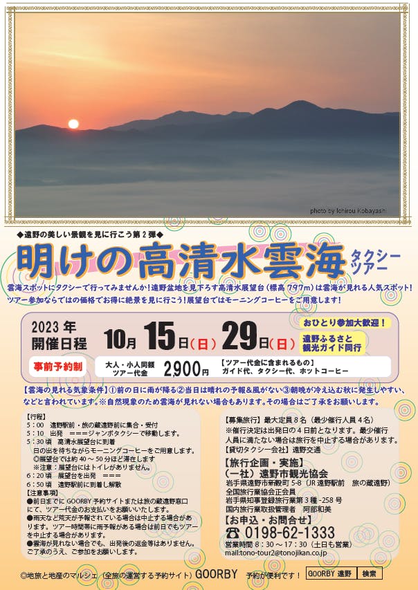 2023/10/06 09:48明けの高清水雲海タクシーツアー日時:10月15日(日)5:00~ 29日(日)5:00~場所:高清水内容:遠野市の名峰【高清水】の雲海を見学するツアーとなります。 遠野の景色を一望出来る遠野名峰高清水。夜は遠野市の夜景を一望する事ができ、日中は綺麗な田園風景と盆地ならではの山々を一望できます。しかし、高清水の一番人気の楽しみ方として、日の出とともに現れる【雲海】を眺める!盆地であるが故に遠野の街に雲海が蓋をして、その上に朝日が昇る。この絶景は絶対に見て頂きたい内容となっています!高清水山は車で雲海が見られる場所に行く事が可能です!早朝ではありますが、遠野市観光協会が主催し、ツアーも開催しております!雲海は11月末までが見ごろです!ご興味のある方は是非、遠野市へおいで下さい!! もっと見る