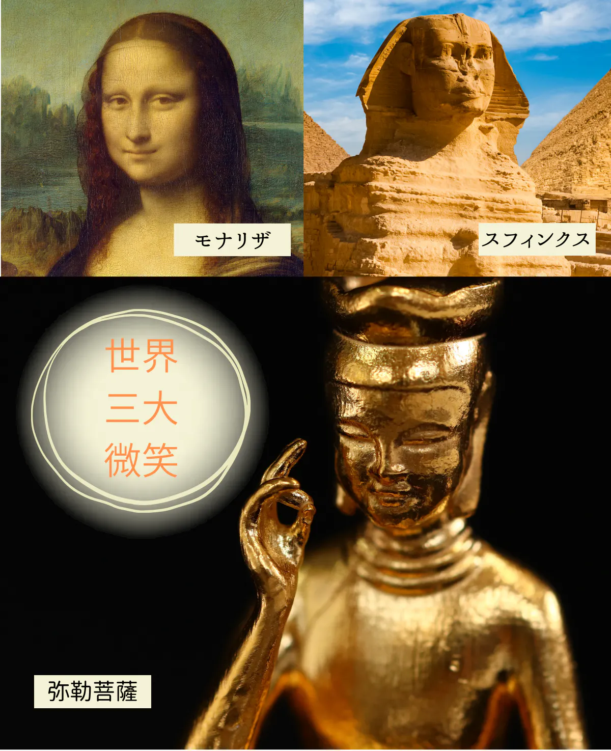 中宮寺の菩薩半跏像は、ほほ笑みがとても美しいため、「モナリザ」「スフィンクス」とともに世界三大微笑とよばれています。