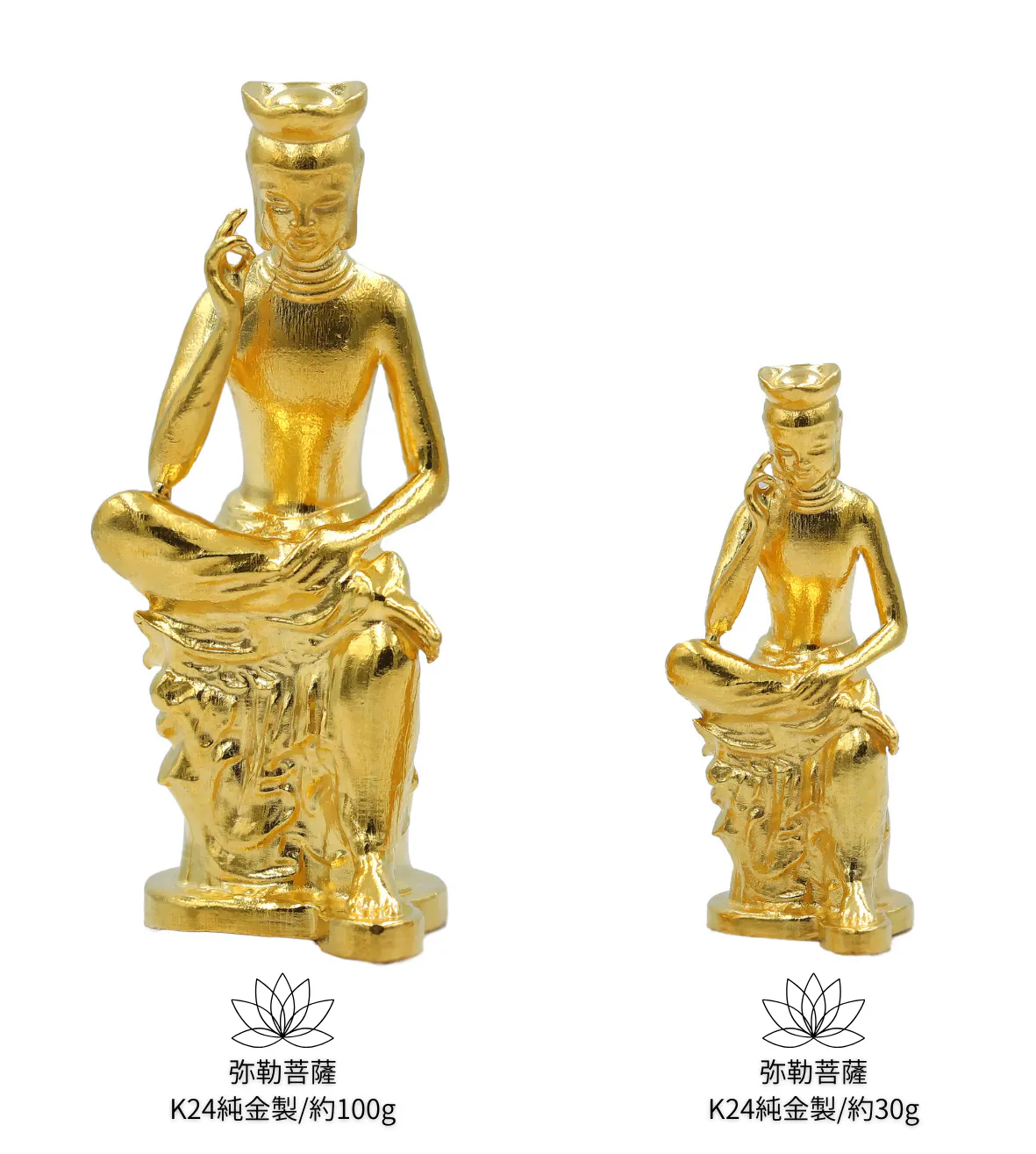 「仏具が相続の対象にならないのではないか」という話は、純金製品あるある、というくらいよく聞く話です。実際に純金製品の上位を占めるものも、仏具だったりします。仏様や阿弥陀如来像など、バリエーションに富んだ仏様の種類の中で、まだ製品化されていなかった(これはあくまで当社調べなので、実際にはあるかもしれません)のが、この弥勒菩薩像でした。