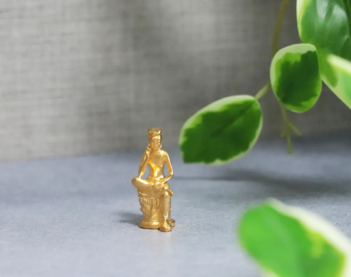 純金の弥勒菩薩像は、二つの特徴である「考える姿」と「ほほ笑み」の表現にこだわって作りました。約1gからの極小サイズながら、細部までこだわって作るのがJUNGOLD製品の魅力です。