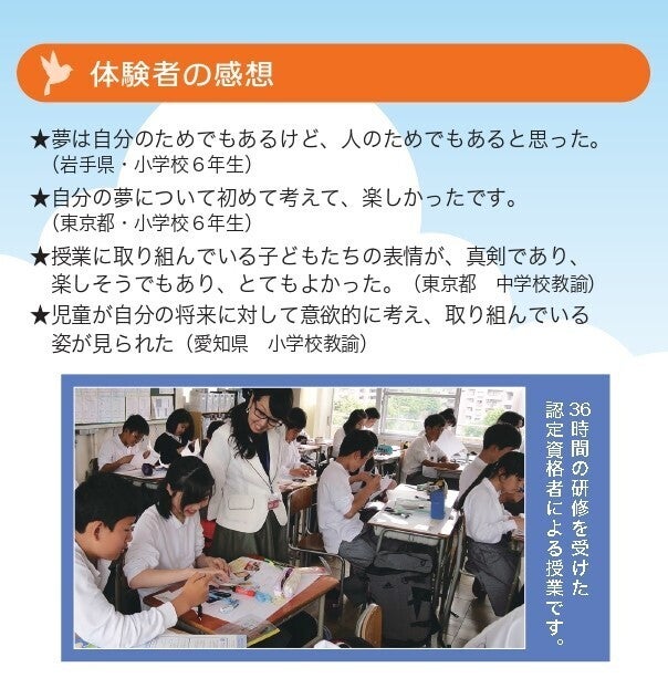 ゆめドリでは、主体的に生きる力を育む『ドリームマップ®』プログラムを、出前授業という形で、全国の小中高校で多くの子どもたちにお届けしています。