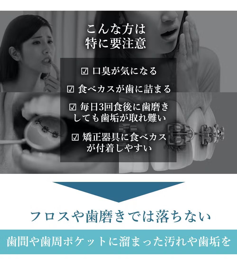 食後の使用や、特に汚れている時に適しています。歯の隙間に深く残った残留物を取り除きます。