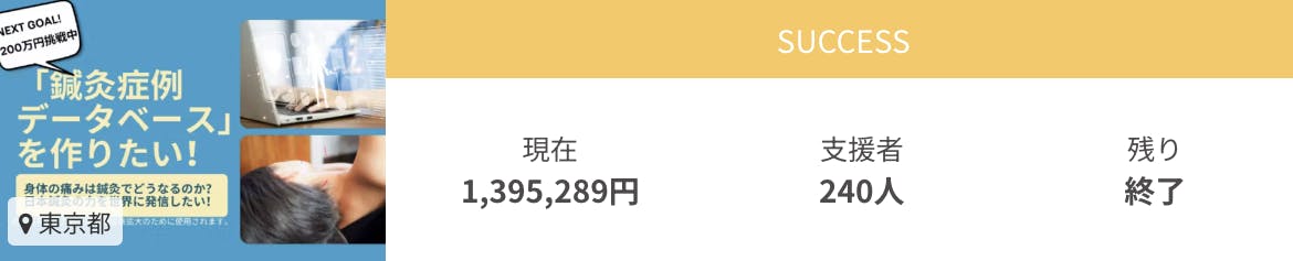 2024/08/12 10:53おかげさまで鍼灸研究クラファン終了しました!ありがとうございました。こんにちは、共同研究者のここちめいどの米倉まなです。2ヶ月に渡り続いたクラウドファンディング、昨日8月11日に終了いたしました。今回240名の方々にご支援いただき、町の鍼灸師、鍼灸学生、鍼灸師の研究者、医師、そしてその先の患者様にもご支援をいただいております。2021年、9名から始まった今回の研究がこのように沢山の方にご協力いただけることになったことが感無量です。本当にありがとうございました。セカンドゴールには至りませんでしたが、いただいた活動資金を最大限活かせるように再検討しなおし、また皆様にも資金の使い道を共有させていただきます。ぜひ電カル研究のオープンチャットにもお入りください。https://line.me/ti/g2/CY93pNy_N_qedBAYa6uYzOHx2iRSPPJIXWUtHA?utm_source=invitation&utm_medium=link_copy&utm_campaign=defaultまた引き続きSNSでも #町の鍼灸院を盛り上げたい でご報告をさせていただいたり、学会等でも発表させていただきます。今回スケジュール的には来年の全日本鍼灸学会に間に合わない可能性がありますが、その次の発表をお待ち頂けると幸いです。今回は本当にありがとうございました。未来の鍼灸業界のためのバトンを、みんなで作っていきましょう! もっと見る