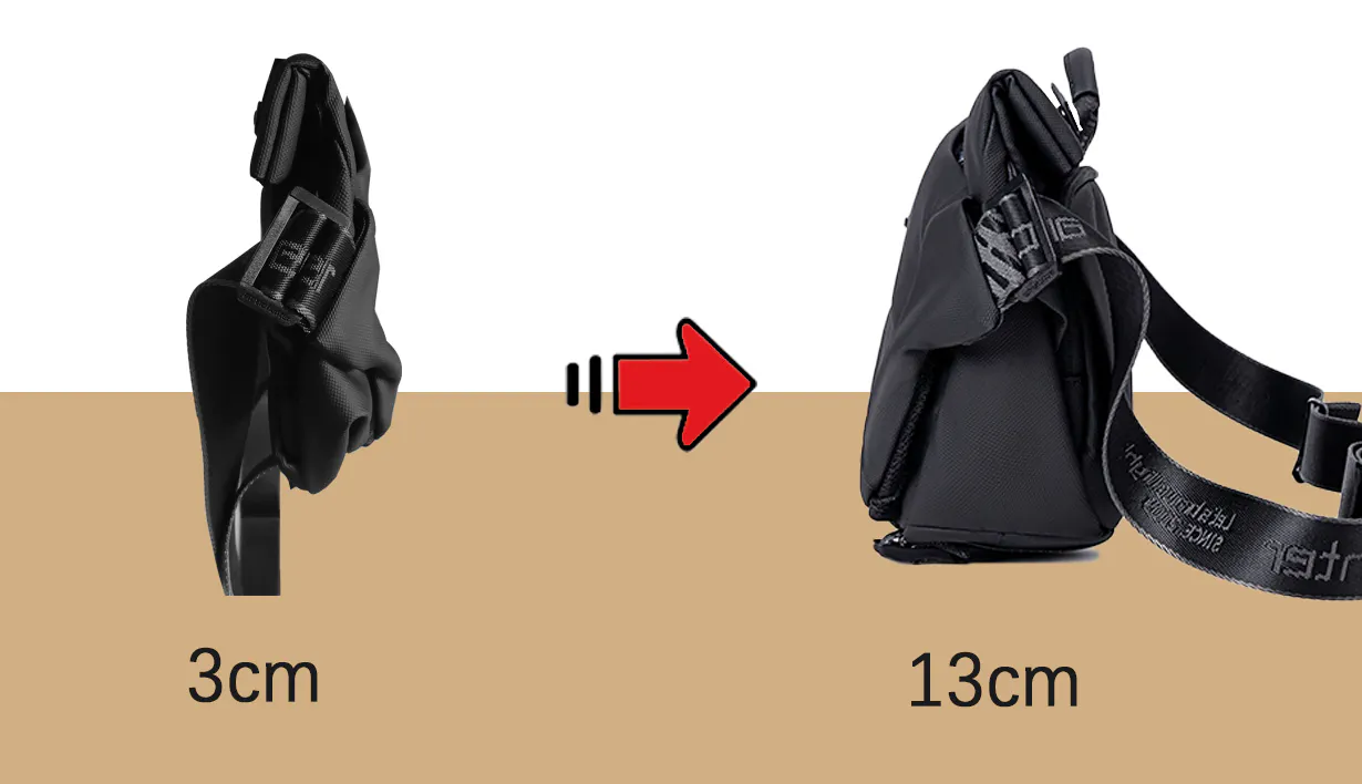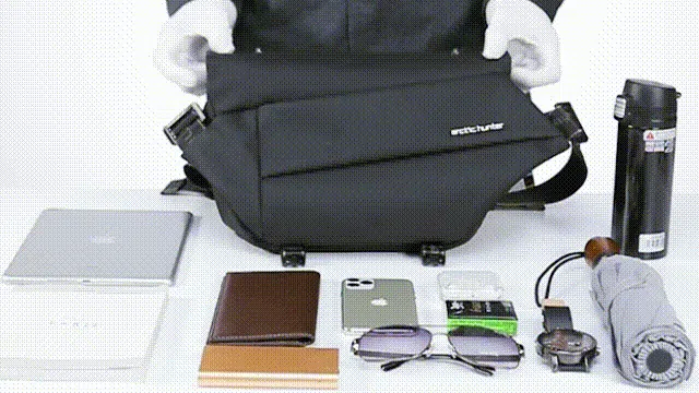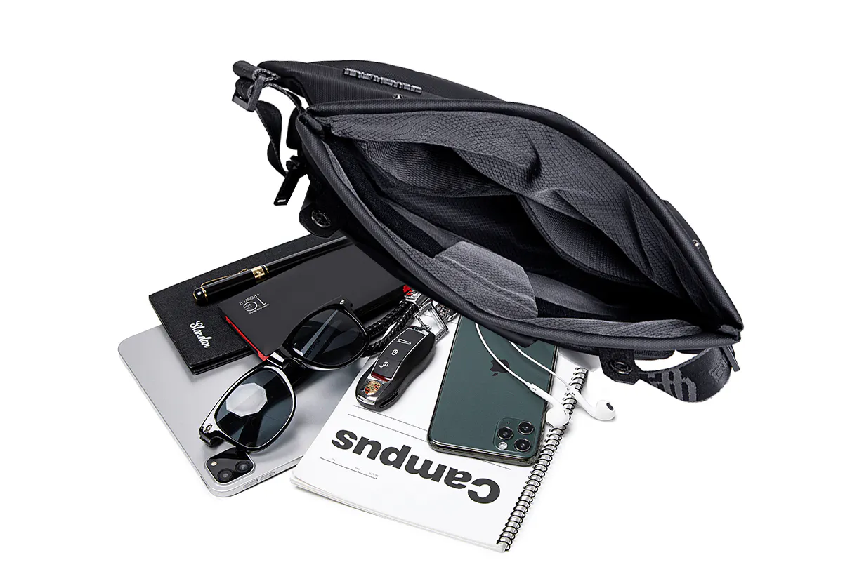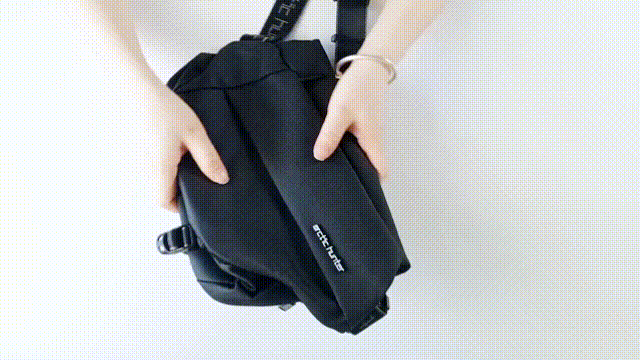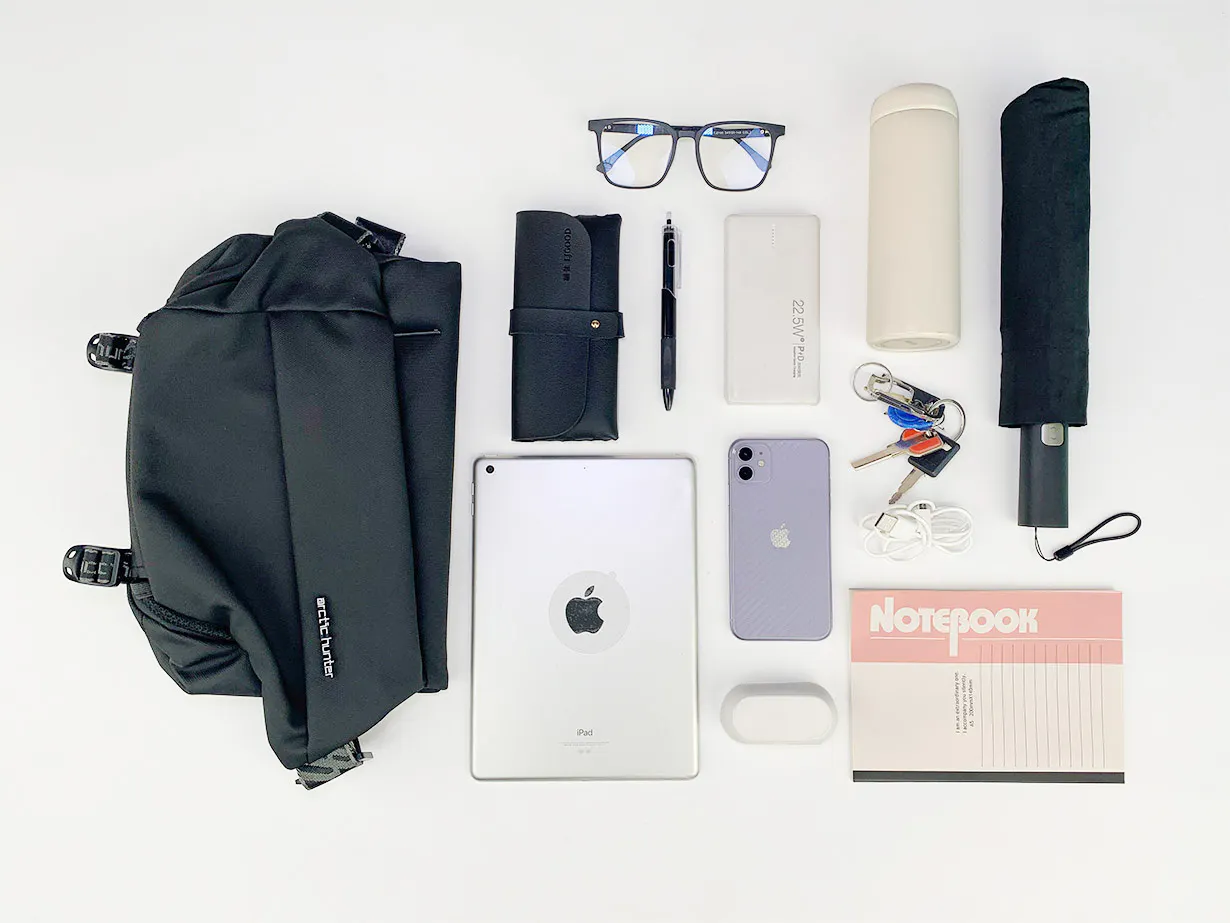 『便利な容量拡張式クロスボディバッグ』は、軽量でコンパクトでありながら一般的なバックパックの収納力を備えているので、普段持ち歩くスマートフォン、財布、折りたたみ傘、マイボトル(水筒)、iPadなどの電子機器、これらをすべて持ち運ぶことができます。