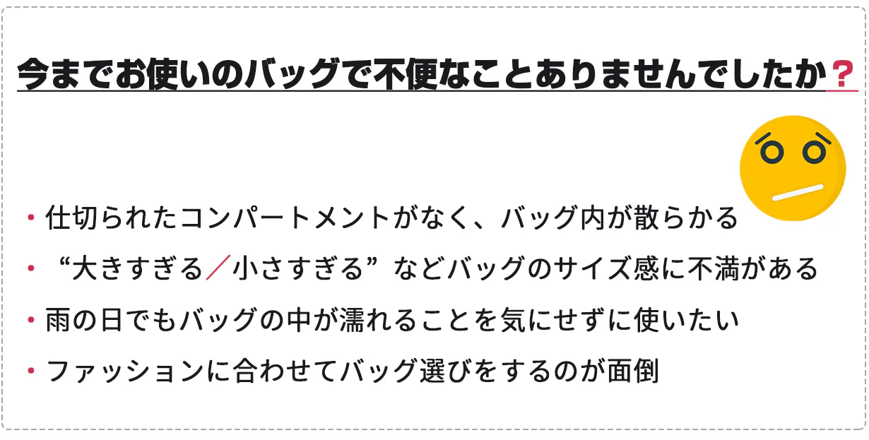 このバッグはそういった悩みを解消し、バッグの中もスマートに収納可能です!