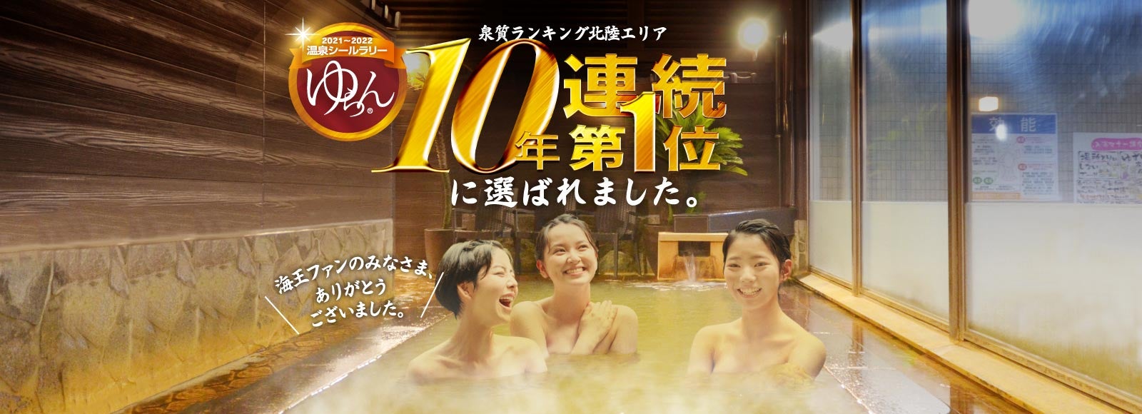 泉質に関してはゆらん様の泉質ランキングにおいて北陸エリア10年連続第1位を獲得させていただき、全国的にも高く評価をいただいております。