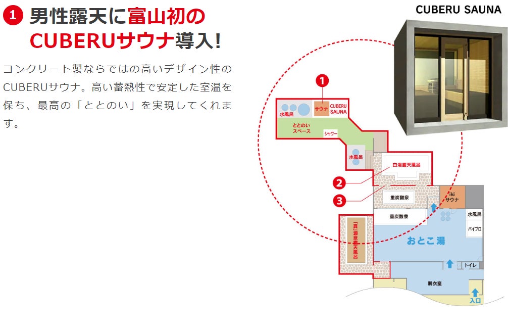 2023/12/09 19:48今回のリニューアルの大目玉の一つである露天にサウナの設置が完了しました。サウナは富山県では初の導入となる「CUBERU」を採用し、はるばる北海道から運ばれました。見た目のおしゃれさはもちろん、中身も高い蓄熱性を兼ねそろえ、とってもいい感じです♪男性のお客様どうぞお楽しみに!!! もっと見る【残り1週間】一番サウナ&一番風呂入浴券のリターン特典を追加いたします!