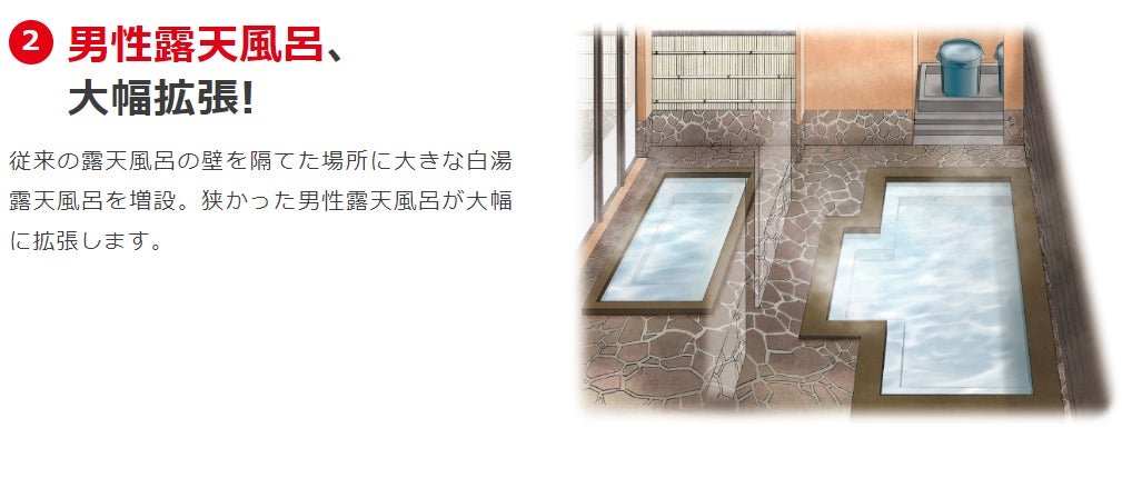 今回のリニューアルでは「男性の露天風呂が狭い」 という長年の課題解決をメインに老若男女全ての方に喜んでいただける7つのリニューアルでさらに「最強最高」な施設へと生まれ変わります!