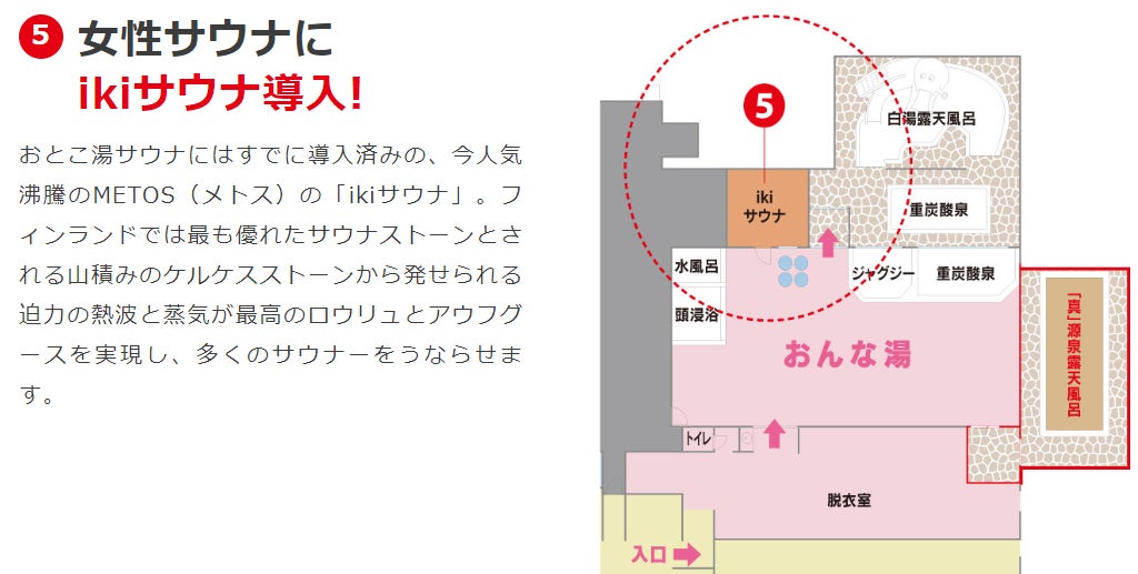 そして今回、原価高騰などのピンチをチャンスと捉え、今まで以上にお客様に楽しみと驚きを感じていただける施設にするため、当館の温浴エリアの新設および長年の課題であったメンズフロアの露天エリア拡大および新サウナ導入をメインとした開湯以来最大のリニューアル工事を実施いたします。