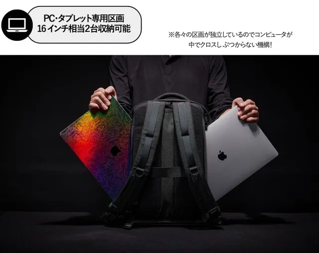 驚きの機構です。背面部にPC用の収納区画が2つ隠されています。MacBook16インチ相当が2台同時に収納可能。2台の区画はそれぞれ独立しているので、端末が中でクロスしぶつからないのです。