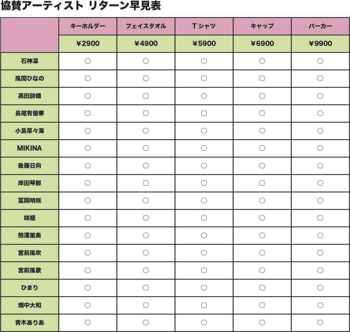 基本リターンの他に、出演者のサイングッズ、また、協賛者のサイングッズ、そしてコラボグッズを追加しました。