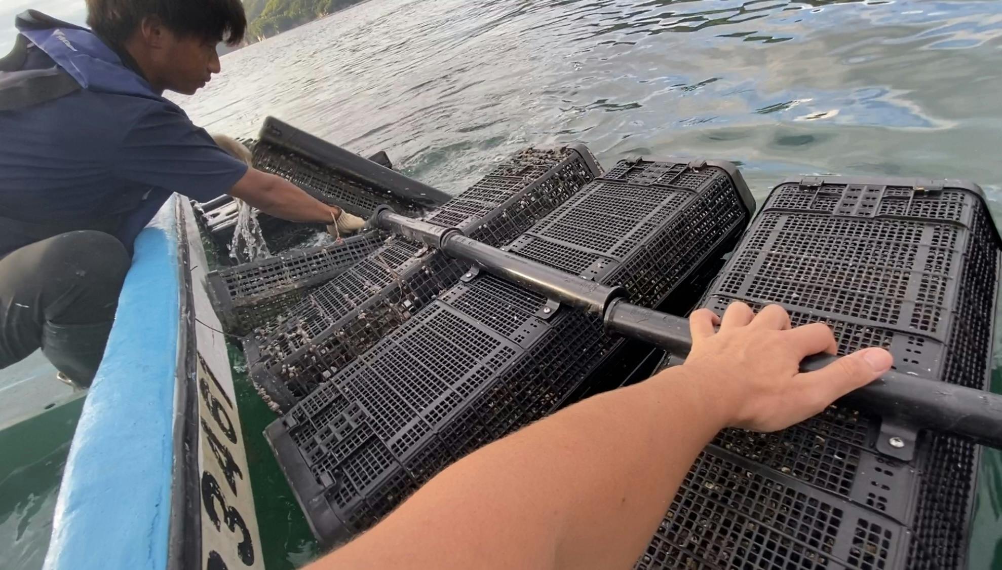 バスケット内にバラバラで入れることで潮や波の影響を受け、バスケット内で牡蠣どうしが