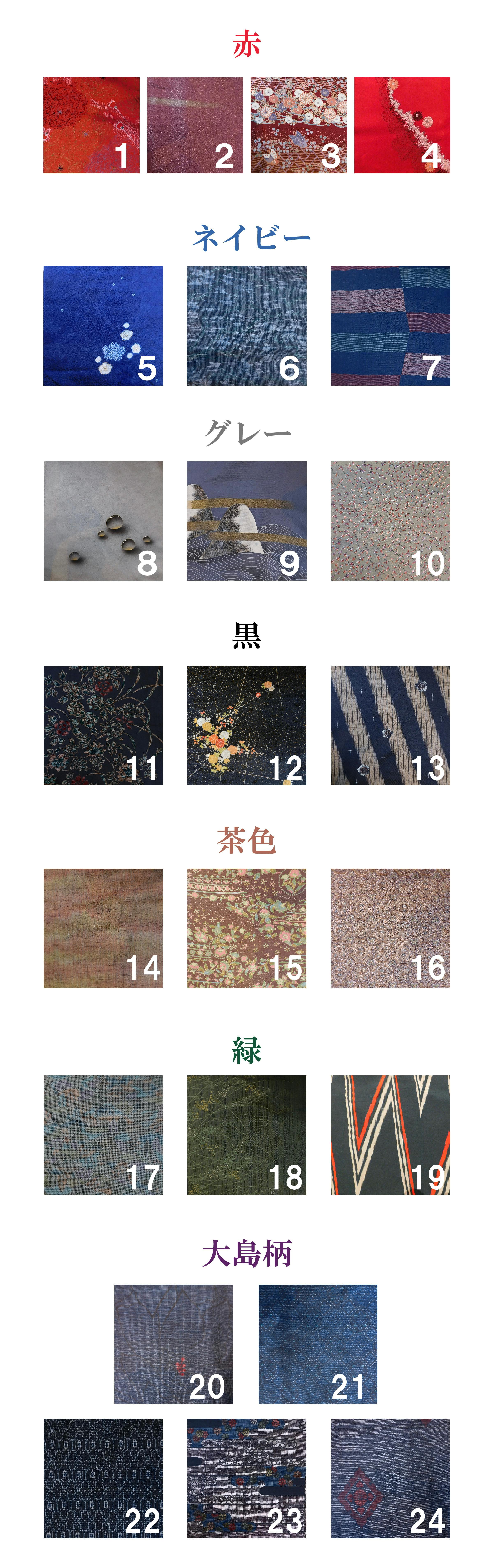 同じ着物から制作しますが、切り取る場所によって見え方が違うことをご了承ください。