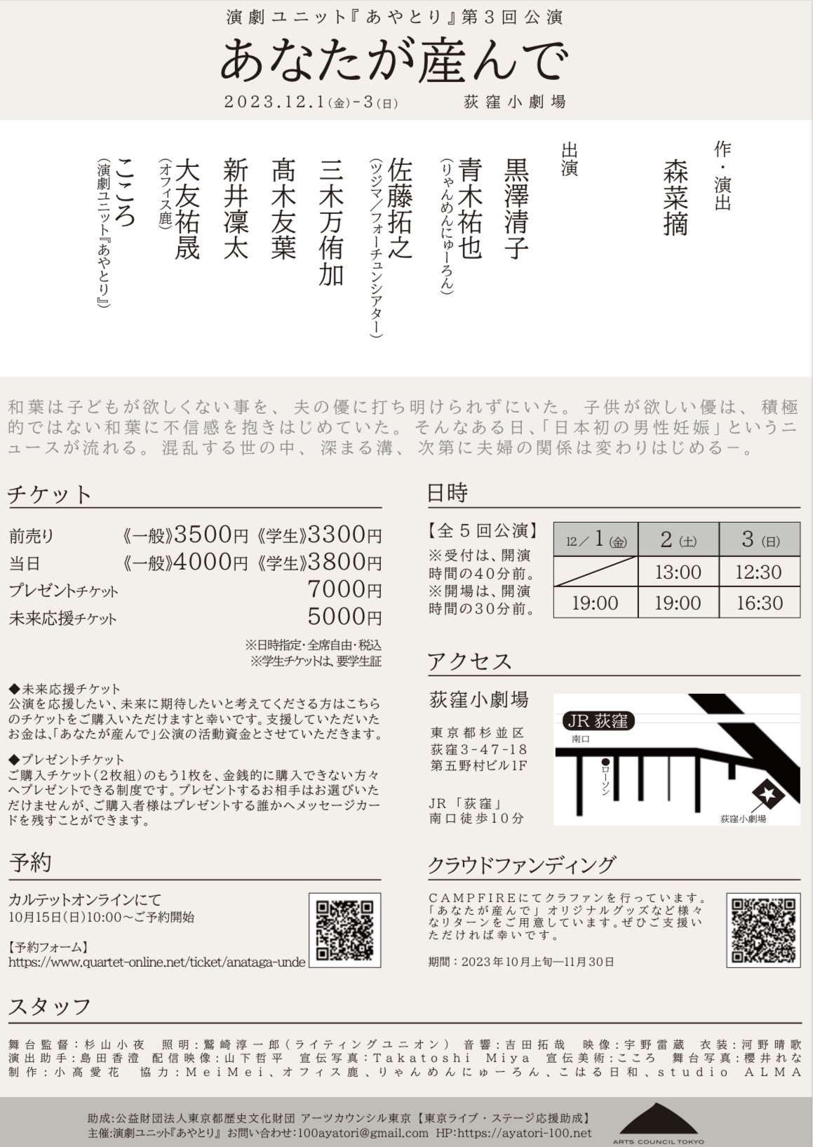 皆様からご支援いただいた支援金は、演劇ユニット『あやとり』第3回公演「あなたが産んで」で発生した以下の費用に使用させていただきたいと考えています。