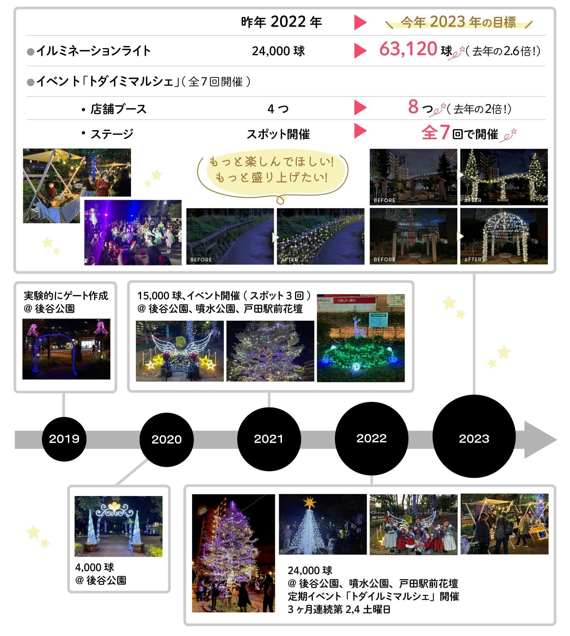 想像を超える多方面の方々のご支援、ご参加をして頂きさらにモチーフライトの増設や定期イベントの開催などで「トダイルミ」をとても充実させていくことができました。