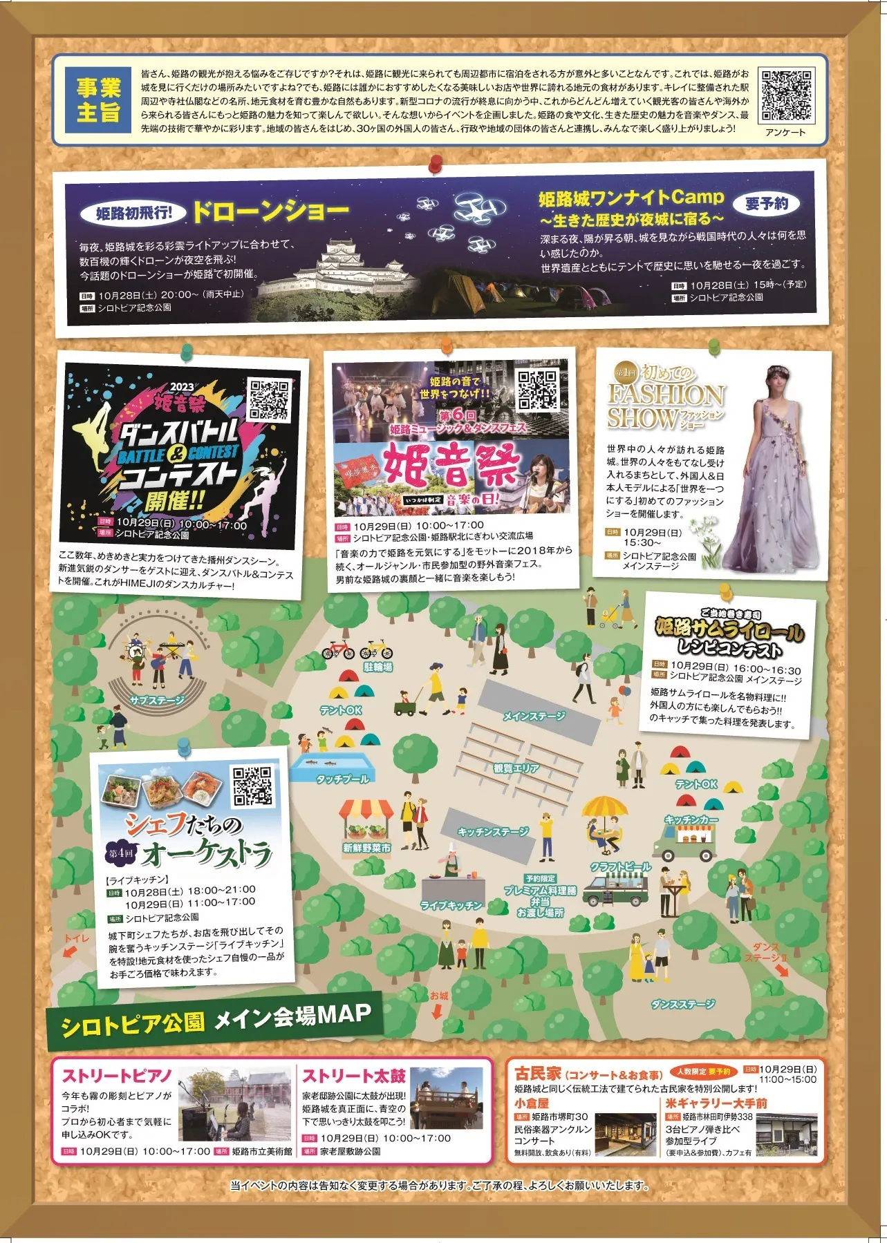 今年は、前日の10月28日の夜に、姫路城のふもとにあるシロトピア記念公園にテントを張り、キャンプをするという企画も進めております。テント持ち込みプランと、お手軽プランとを準備予定。晴れていれば、城のライトアップとともにドローンショーも開催予定です。