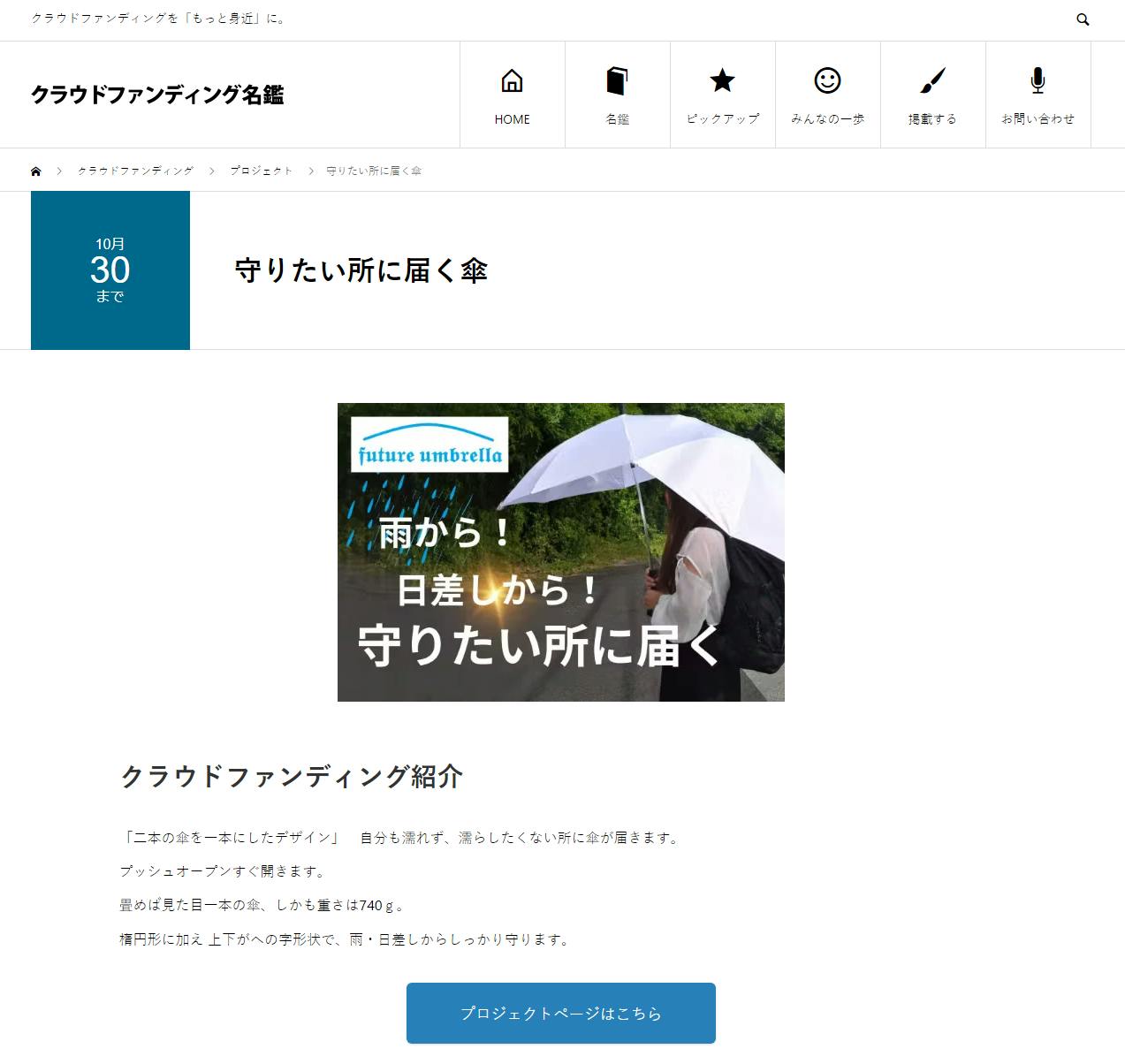 2023/10/01 20:00皆様こんにちわ! ご支援頂いた方には心より感謝申し上げます。この度 「Future Umbrella」がクラウドファンディング名鑑に掲載されました。クラウドファンディング名鑑「Future Umbrella」をもっと皆様に知って頂き、使って頂いて便利さ実用性を知って頂きたいと思います。引き続きよろしくお願いいたします。 もっと見る