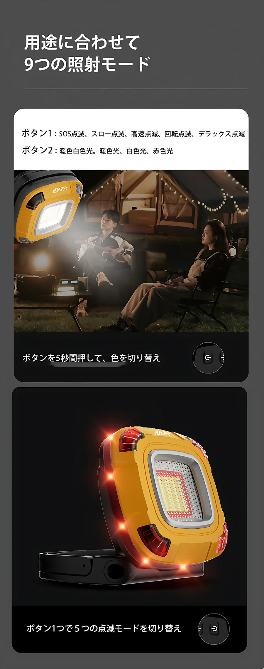 4段階調色、5種の点滅モードで、場面に応じて9つの照射モードを使い分けることができます。