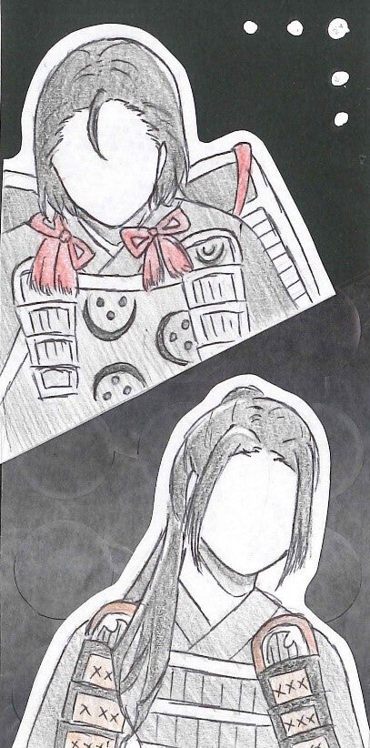 後方に現在の高千中学校の校章をイメージした三角形を描き、前方に巴御前と薙刀を配置しました。また、下には左から旧外海府中、現高千中、旧高千中、の校章を入れました。校章を三つ配置した理由は、旧外海府中に始まった文弥人形の歴史や、旧高千中の伝統を、今の高千中でも大切にしたいと思ったからです。