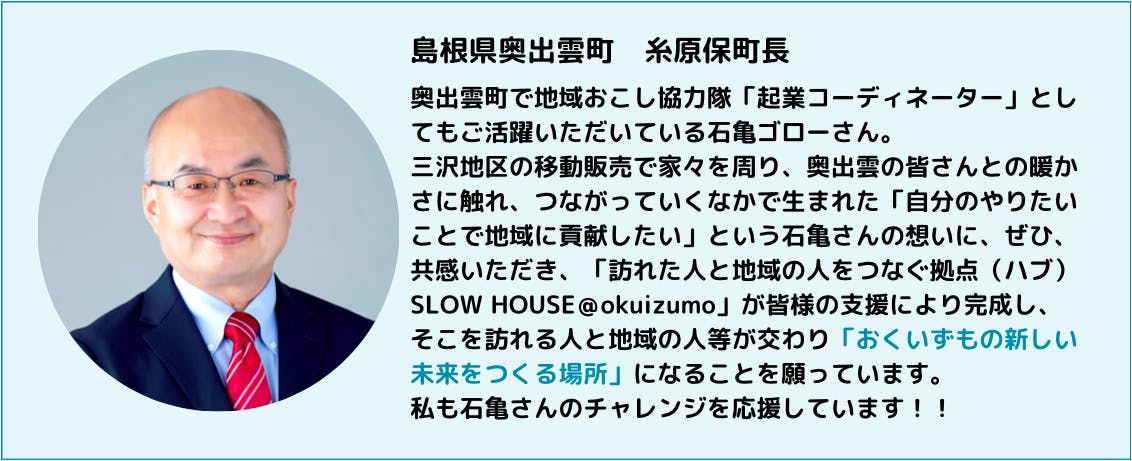 初めまして。島根県奥出雲町で地域おこし協力隊をしている石亀ゴローと申します。この度、2024年7月に「SLOWでDEEPに暮らす旅in奥出雲〜人生の転機に訪れてほしい場所〜」をコンセプトにした『SLOW HOUSE@okuizumo』のオープンに向け、クラウドファンディングに挑戦することにしました。