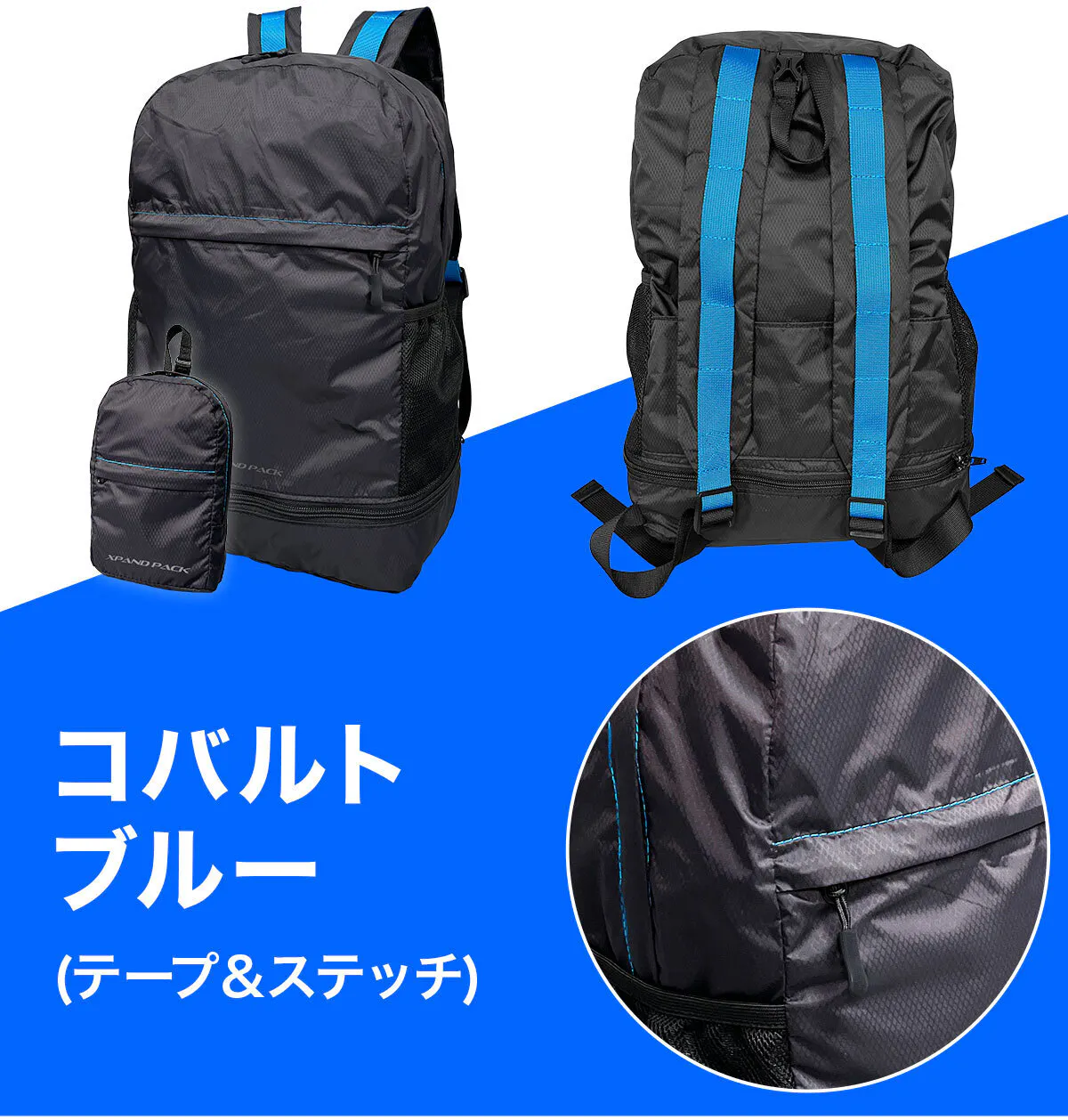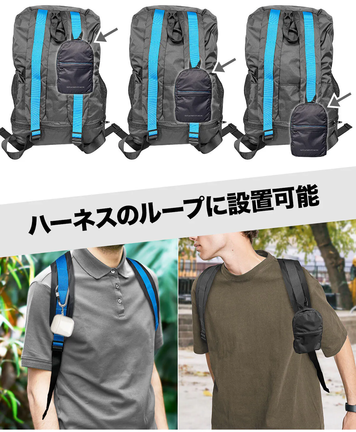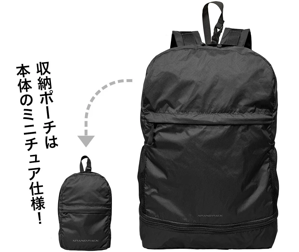 「XPAND PACK (エクスパンド パック)」は、手のひらサイズに折りたためるリュックで、どこにでも持ち運べる便利さが魅力です。