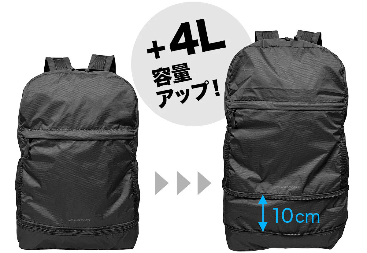 拡張機能で高さが10cm、収納が4Lアップします。予定外の荷物が増えてもしっかり収納できます。