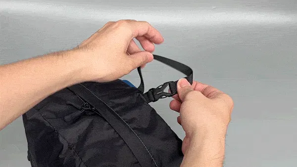 持ち手をバックル式にすることでいろいろな場所に引っ掛けられるようにしました。カフェで椅子に掛ければ盗難防止になります。