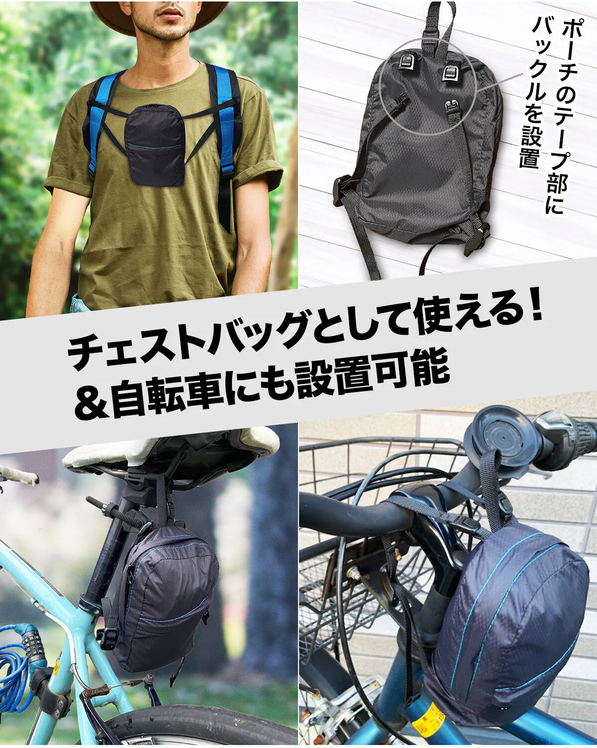 収納ポーチはチェストベルト&チェストバッグとしても使用可能です。ポーチのハーネステープで長さ調整も可能です。ポーチのバックルを活用することで多彩な取り付け方法を実現しました。