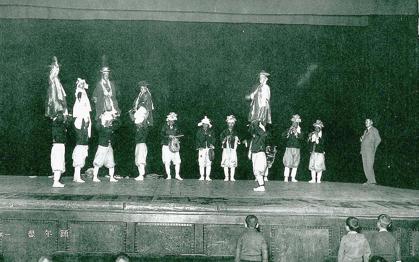 『全国民俗芸能大会』のルーツは、1925(大正14)年10月に初代日本青年館が完成した際、ホールのこけら落としとして開催した「郷土舞踊と民謡の会」が始まりです。郷土で保存継承されている芸能を東京のホールの舞台で上演するという、当時としては斬新な取り組みが好評を博しました。