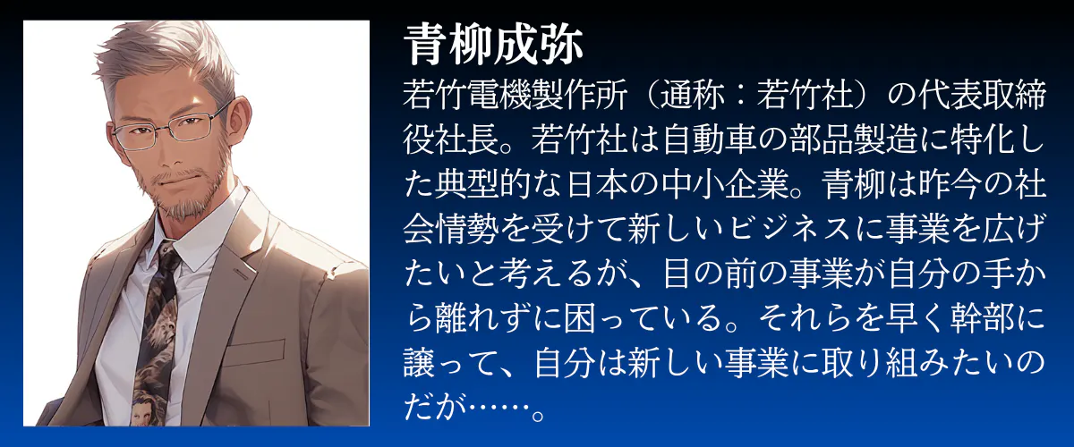 若竹電機製作所の社長、青柳成弥が、未知のAI「ChatGPT」を組織の成長の鍵として捉える物語。青柳は、ChatGPTの力で時間やコストを節約し、新たなビジネスの扉を開くことに挑戦します。彼のビジョンは、AIと人間が共に新しい価値を創出する未来を目指しています。
