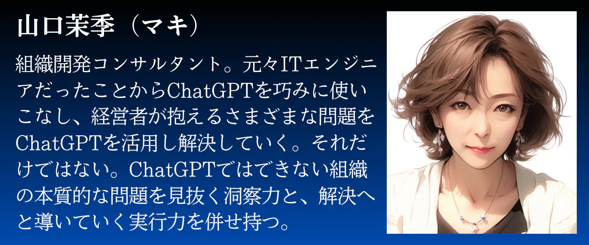 ビジネスファシリテーション・サービス 代表SE、プロジェクトマネージャ、ITコンサルタントとして20数年IT業界に在籍。リーマンショックをきっかけに、組織開発やファシリテーションの組織導入のコンサルタントに転身し、大企業の人事部・事業部や中小企業の経営者・経営幹部の支援を行う。2023年ChatGPTが普及したことをきっかけに15年ぶりにIT活動を再開し、「AI×OKR(目標達成手法)×組織開発」の組織導入サービスを開始する。著書に「仕事の質が劇的に上がる88の質問」(日経BP社)、「ファシリテーターの道具箱」(共著:ダイアモンド社)がある。ライバルは20代の二人の息子。趣味は健康。自称AIおばさん。
