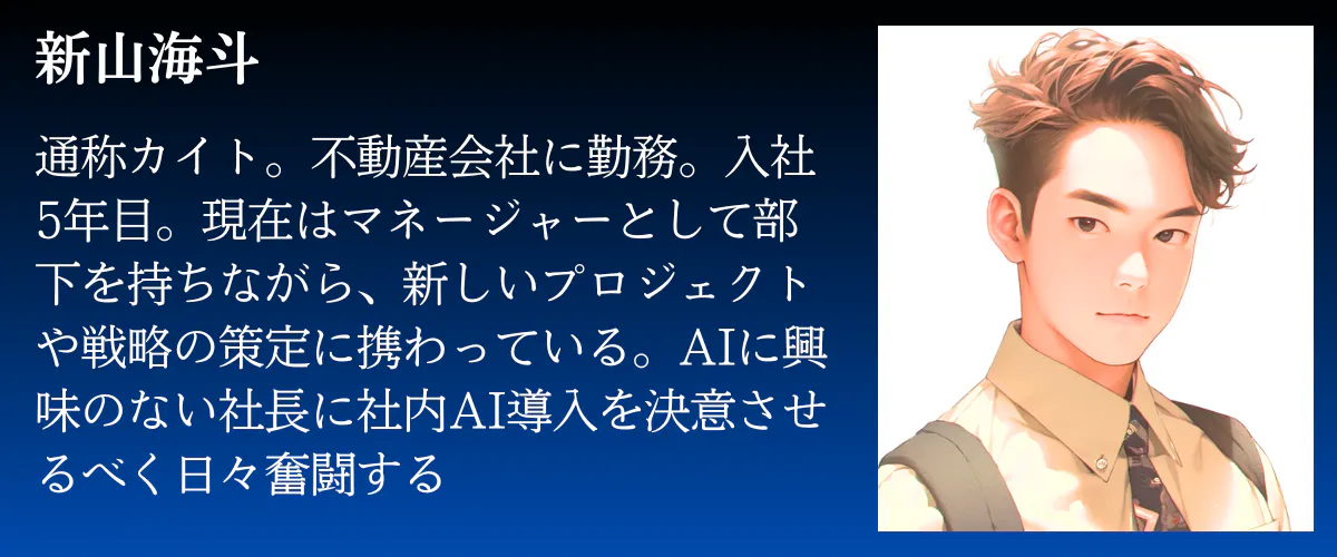 不動産会社に勤務する入社5年目の若手ビジネスリーダー、新山海斗、通称「カイト」の挑戦を描く物語。彼は社内のAI導入の必要性を認識し、無関心な社長を説得しようとします。