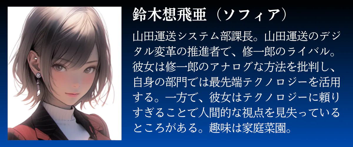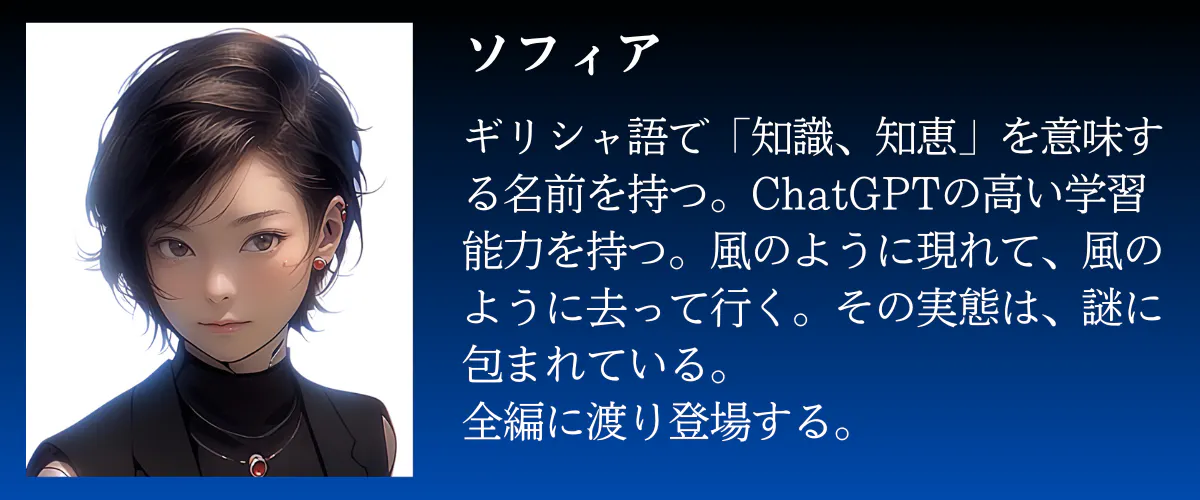 新岡優子(にいおかゆうこ)、松山将三郎(まつやましょうざぶろう)、寺下薫(てらしたかおる)、そしてAIであるソフィア。