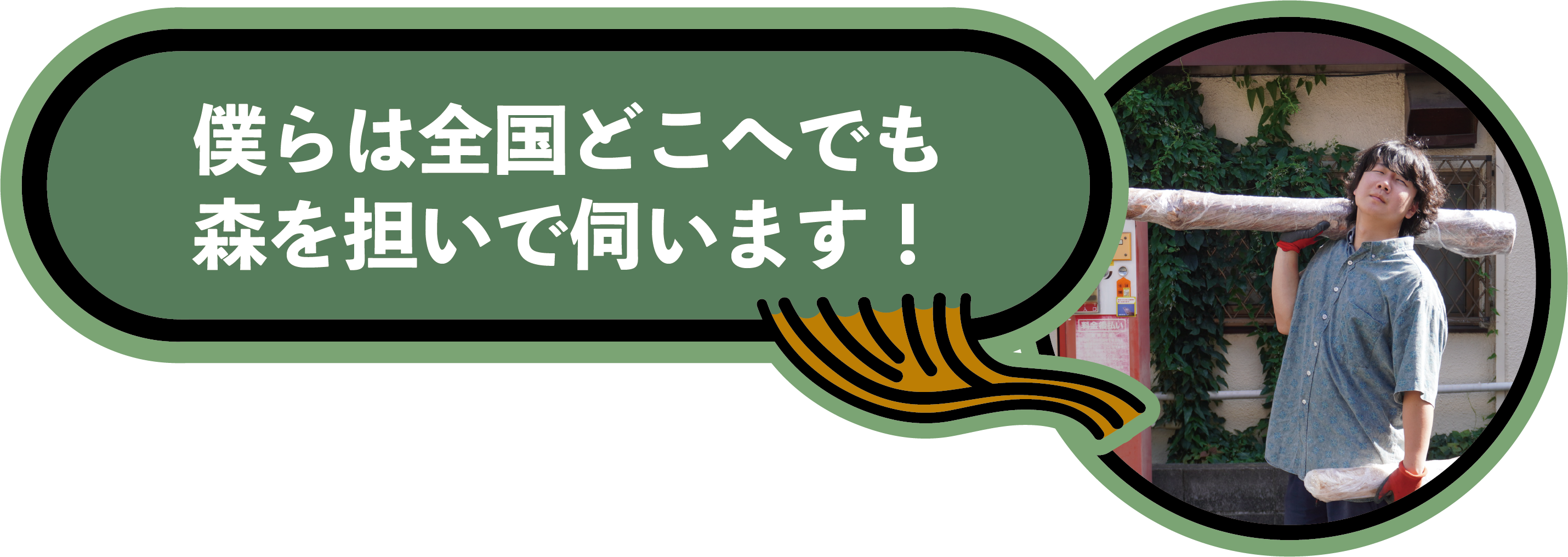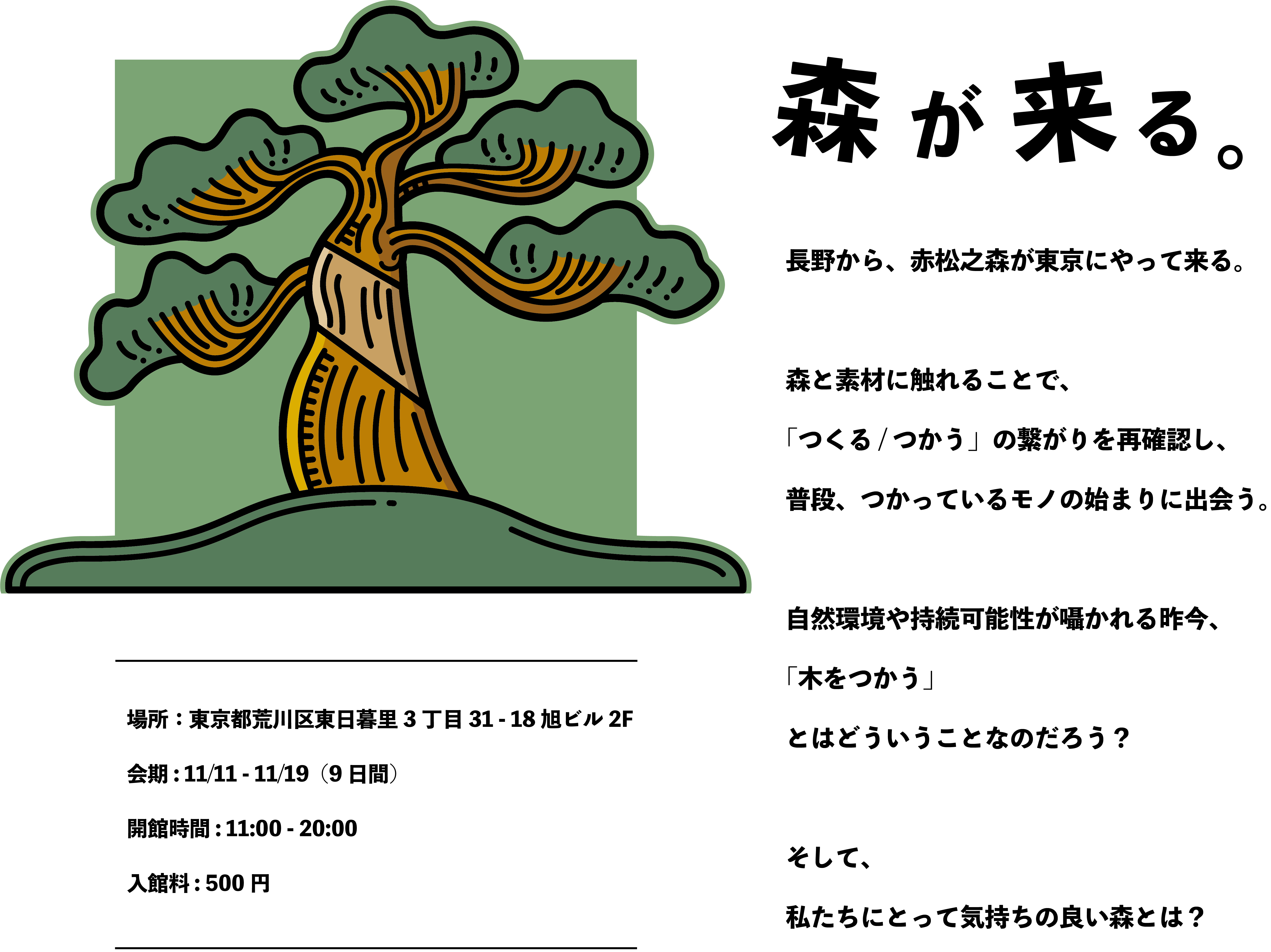 都市に森を持ち込むことで、「森林資源の新たな出口」として、また展示を通して森に興味を持った人たちにとっては「森に触れる入り口」になるような、そんなトンネル的役割を持てるような展示にしたいと考えています。