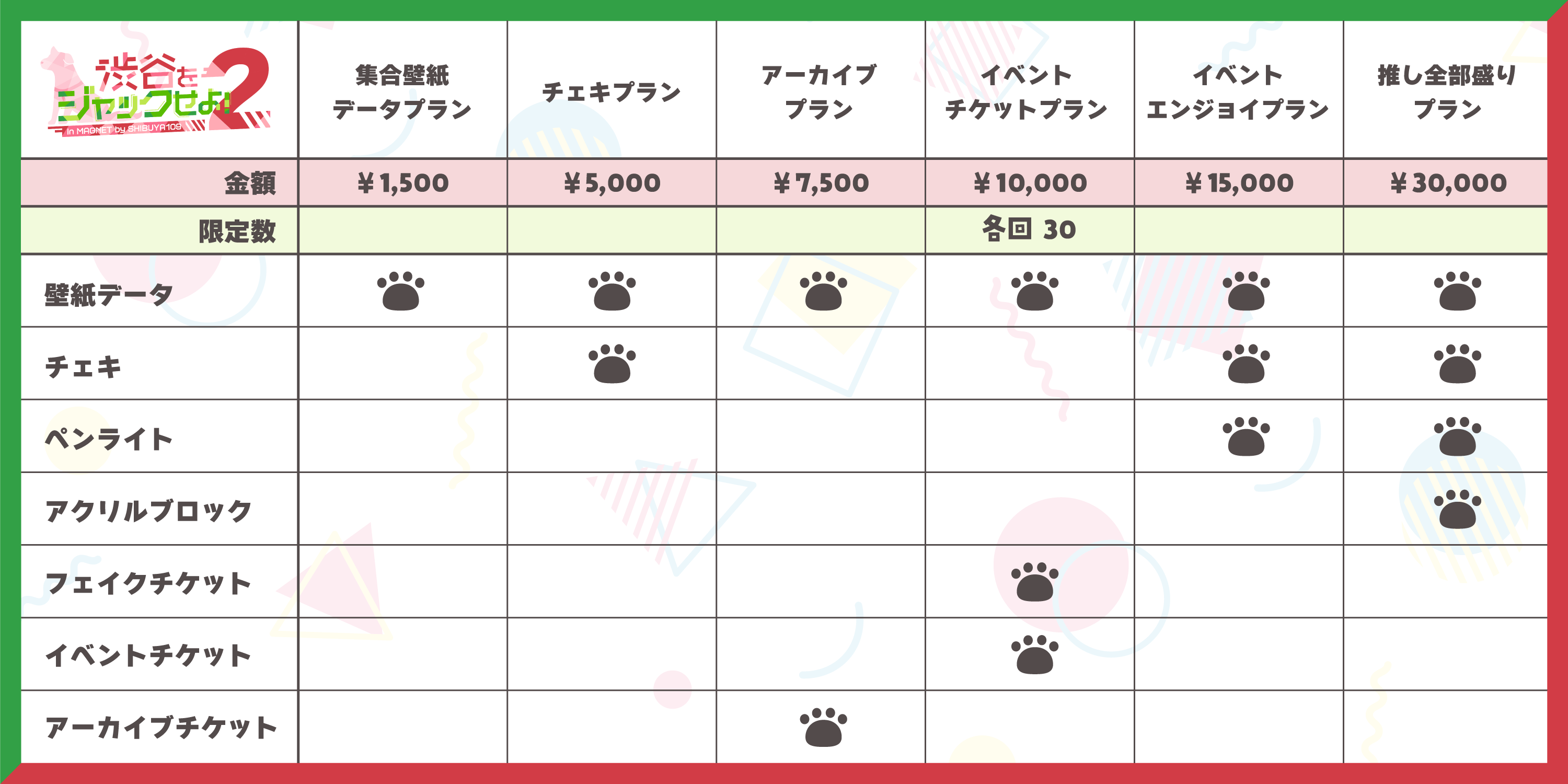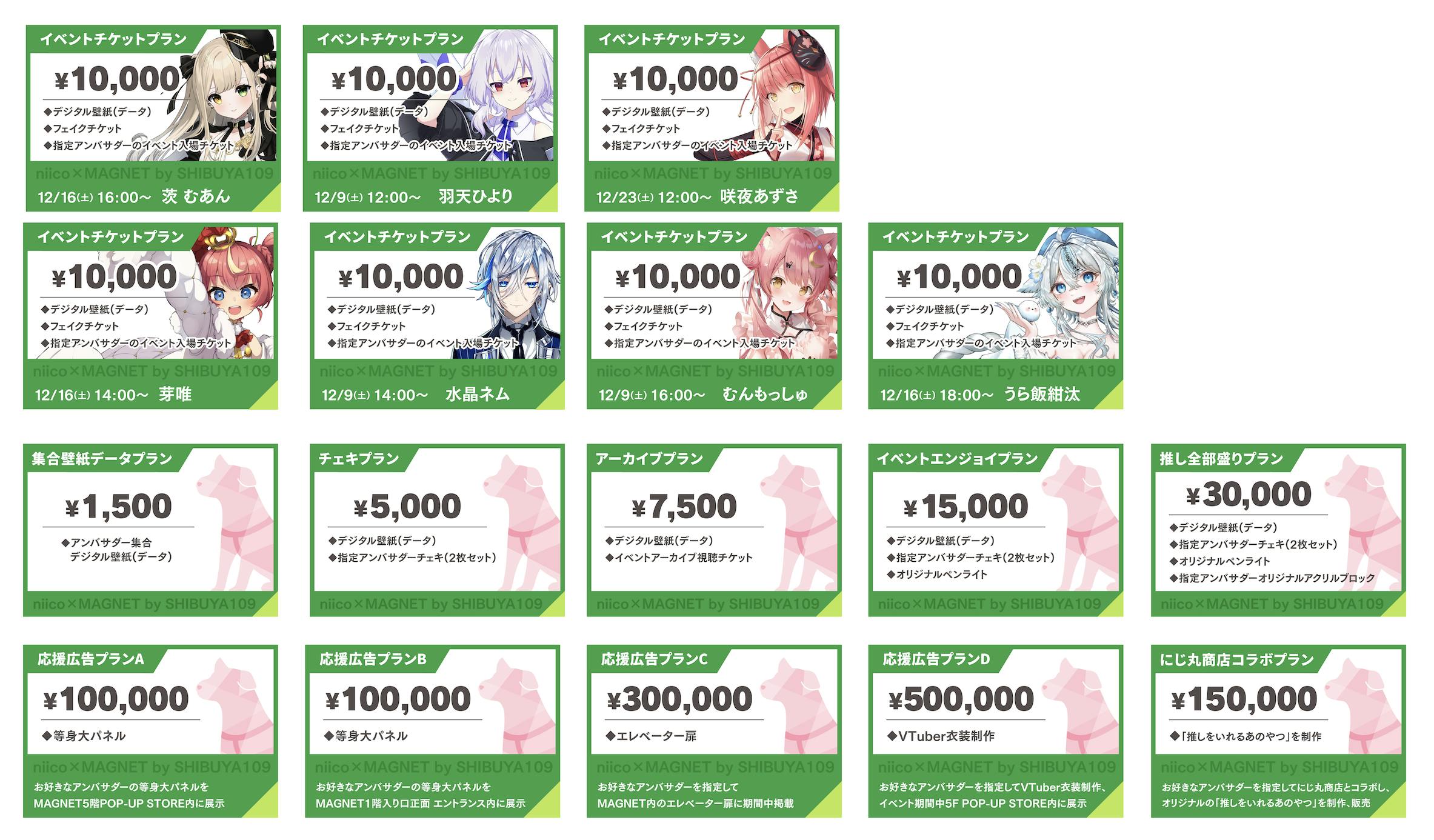 下記にて紹介する全てのプランにPOP-UP STORE内でランダムブロマイドや集合イラストのクリアファイルを販売できる権利が付属します。