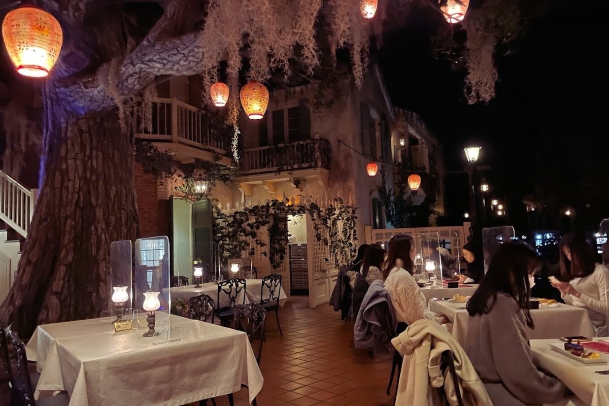そこはどこか懐かしいステンドグラスのランプの明かりが灯され、ノスタルジックな雰囲気に陽気な音楽。窓側を見れば空から降りる花と緑と星が夜景に広がる。日常とはかけ離れた幻想的な情景はあなたの胸をときめかせます。